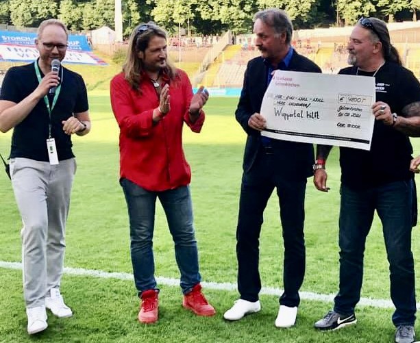 Die Scheckübergabe im Stadion am Zoo: (v.l.) Stadion-Sprecher Carsten Kulawik, Stefan Mageney, WSV-Vorstand Peter Neururer sowie Frank Schwung, die mit seinem Verein „Der Biker“ 4.200 € für Flutopfer gesammelt hatte, die dann von WSV-Mäzen Friedhelm Runge und seiner Firma EMKA verdoppelt wurden – © Jason MageneySchirmherr des 13. Benefiz-Festivals am 21. August war in alter Tradition der Wuppertaler Oberbürgermeister. Für OB Dr. Uwe Schneidewind war es der erste „Auftritt“ für WUPPERTAL HILFT!.