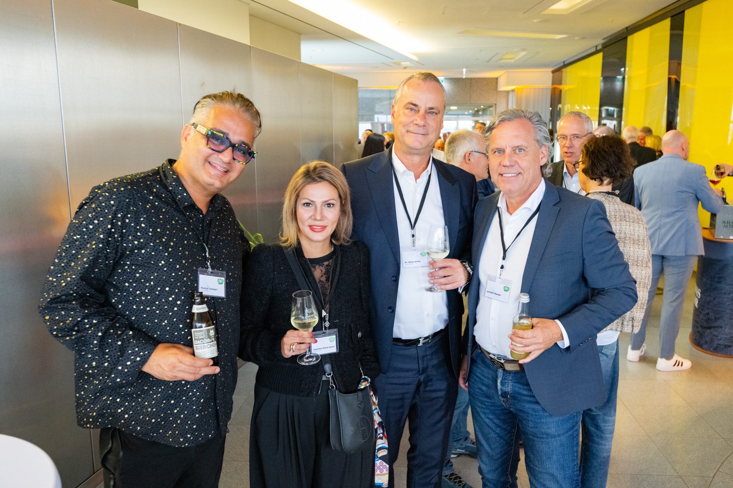 Das Ehepaar Sepi und Dr. Oliver Klöck (M.) u.a. mit dem Künstler Sharyar Azhdari (l.) – © Fotostudio Essen / Dr. Claudia PosernUnd daran tragen aus ihrem Blickwinkel auch die Medien eine Mitschuld: „Erst wurde die Ampel verunglimpft, jetzt ist es die neue Koalition. Es wird ständig über Unstimmigkeiten in der Regierung berichtet. Dabei gehört Streit doch zur Demokratie dazu. Ich möchte, dass sich Politiker über Positionen und Werte miteinander auseinandersetzen, für ihre Überzeugungen streiten. Wir haben nun einmal eine parlamentarische Demokratie mit unterschiedlichen Parteien: Es heißt dann aber immer in den Medien lapidar: Die Parteien konnten sich im Koalitionsvertrag mit ihrer Position nicht durchsetzen. Wichtig ist doch, dass am Ende etwas Gutes dabei herauskommt. Es ist doch ganz einfach: Wer sich zu 100 Prozent durchsetzen will, muss 100 Prozent der Stimmen erringen. Und das ist in der heutigen Zeit fast unmöglich.“
