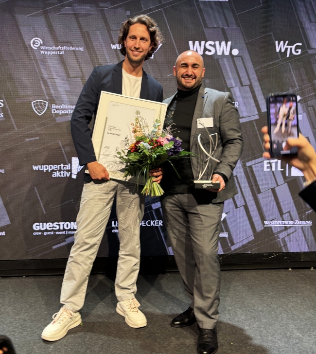 In Sachen Innovation hatte das junge Unternehmen „experial GmbH“ die Jury überzeugt, wie Laudator Markus Hilkenbach (Geschäftsführer der WSW) ausführte. Die Geschäftsführer Nader Fadl und Dr. Tobias Klinke haben, protegiert von der Bergischen Uni, aus der „KI“ eine Geschäftsidee entwickelt und eine effizientere und kostensparende Marktforschung auf den Markt gebracht.