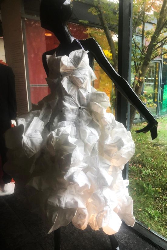 Phantasie und Kreativität standen bei der Schaffung dieser künstlerischen Kleidungsstücke im Vordergrund. So wurden Etiketten und Modelabels, herausgetrennt aus Jacken und Mänteln, als Tanz-Roben quasi wiedergeboren.