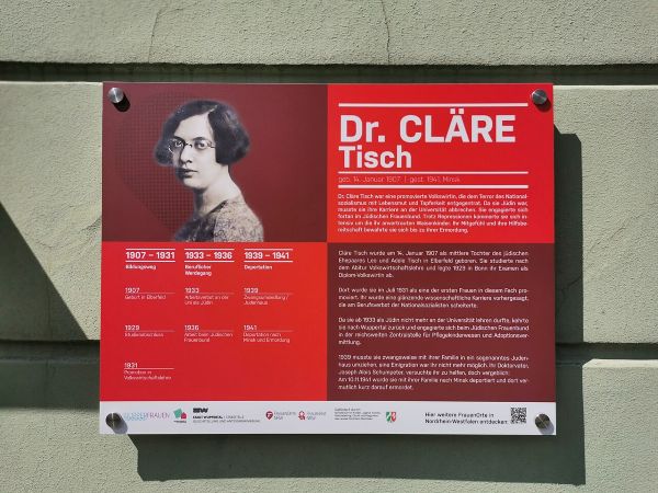 2024 erhielt Cläre Tisch im Rahmen des Projektes Frauenorte eine Gedenktafel an der Alten Synagoge in Wuppertal. „In der Feierstunde am 9. Juni 2024 wurde Dr. Cläre Tisch als erste Frau in Wuppertal mit einem offiziellen FrauenOrt NRW geehrt und als jüdische Wirtschaftswissenschaftlerin und engagierte Sozialarbeiterin im Jüdischen Frauenbund gewürdigt“, sagt Frambach abschließend. „Diese Form der Erinnerung ist ein Zeichen des Respekts, vor allem aber auch ein Aufruf, das Engagement mutiger Frauen wie Cläre Tisch nicht in Vergessenheit geraten zu lassen. Auf der Gedenktafel stehen die Worte: ‚Ihr Leben steht für wissenschaftliche Exzellenz, soziale Verantwortung und den Verlust durch nationalsozialistische Verfolgung. ‚ Treffender kann der schicksalhafte Verlauf des Lebens von Cläre Tisch in wenigen Worten wohl kaum zusammengefasst werden.“
