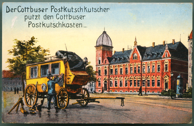 Ein echter Zungenbrecher auf einer alten Postkarte: „Der Cottbuser Postkutschkutscher putzt den Cottbuser Postkutschlasten“ – © CC BY-SA 3.0Ganz anders sehe es aber bei den Konsonanten aus. „Bei den Konsonanten erzeugen wir eine Art von Behinderung für den Luftstrom. Damit unterscheiden sie sich deutlich von den Vokalen. Das machen wir an verschiedenen Orten und auf verschiedene Arten, oft mit der Zunge, aber auch mit den Lippen. Die Kombination aus Ort und Art ist elementar dafür, welcher Konsonant produziert wird.