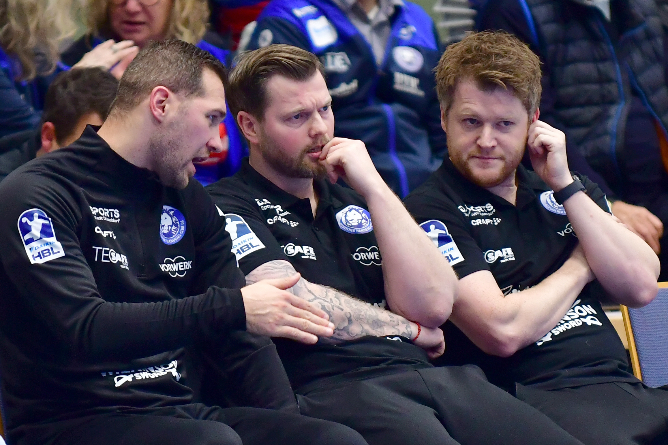 Das Trainergespann Arnor Thor Gunnarsson (M.) und Markus Pütz (r.) musste lange um den Sieg zittern. Links der verletzte BHC-Kapitän Tomas Babak – © Jochen ClassenBergischer HC – TSV Hannover-Burgdorf 40:38 (15:12)
