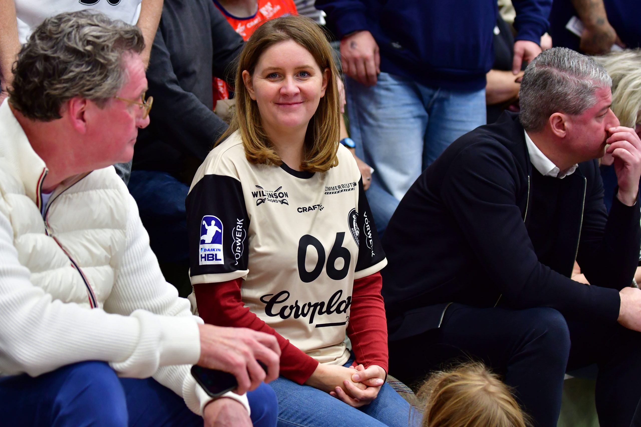 Wuppertals neue Oberbürgermeisterin Miriam Scherff, eingerahmt von den BHC-Geschäftsführern Jörg Föste (l.) und Philipp Tychy, drückte den „Löwen“ in der Unihalle die Daumen – © Jochen ClassenUnd tatsächlich: Eine Minute vor dem vermeintlichen Ende lagen die Löwen 31:33 hinten, verkürzten durch Wasielewski und hatten nach einem Fehlwurf von Renars Uscins die unverhoffte Chance zum Ausgleich. Steinhaus nahm sich die Kugel und knallte sie zum 33:33 rein. Es fühlte sich an, als hätte er zum Sieg getroffen. Doch es musste eine zweite Verlängerung her. Und in der waren die Bergischen dann das coolere Team. Beyer stellte auf 35:34, Julian Fuchs versenkte aus der Drehung zum 36:34 – und im zweiten Abschnitt der zweiten Verlängerung hatte der BHC sogar Anwurf. Beyer traf per Strafwurf zum 37:34.