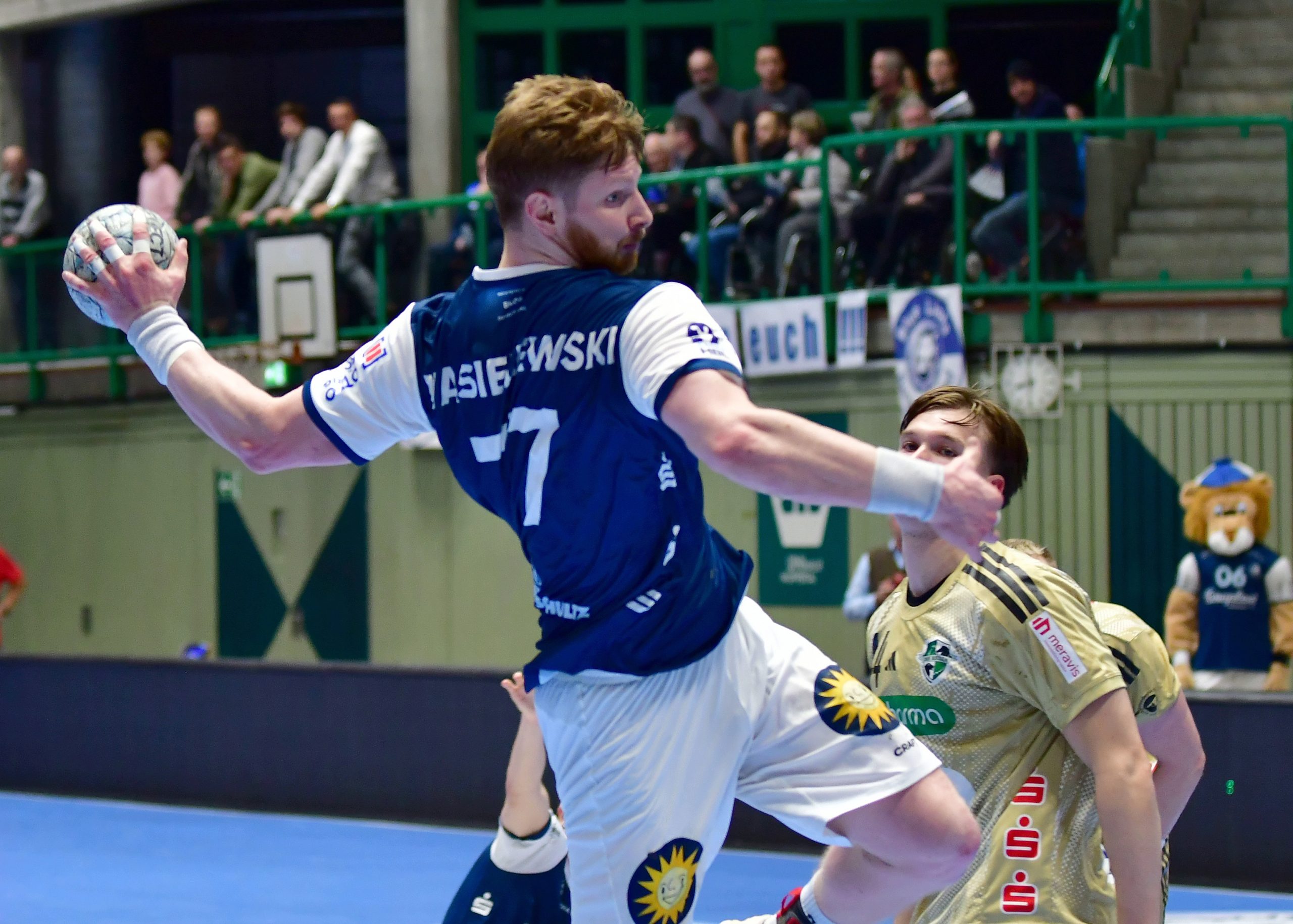 Noah Beyer erzielte gegen Hannover-Burgdorf zehn Treffer – © Jochen ClassenUnd in den wichtigsten Momenten überhaupt übernahm Sören Steinhaus die Verantwortung. Doch der Reihe nach: Die Löwen führten bereits zur Pause durchaus verdient mit 15:12. In der Deckung agierten sie konstant gut, im Angriff weitestgehend. Die Mannschaft ging in die Tiefe, ließ sich kaum festmachen, beziehungsweise spielte den Ball erfolgreich zum freien Mann weiter.