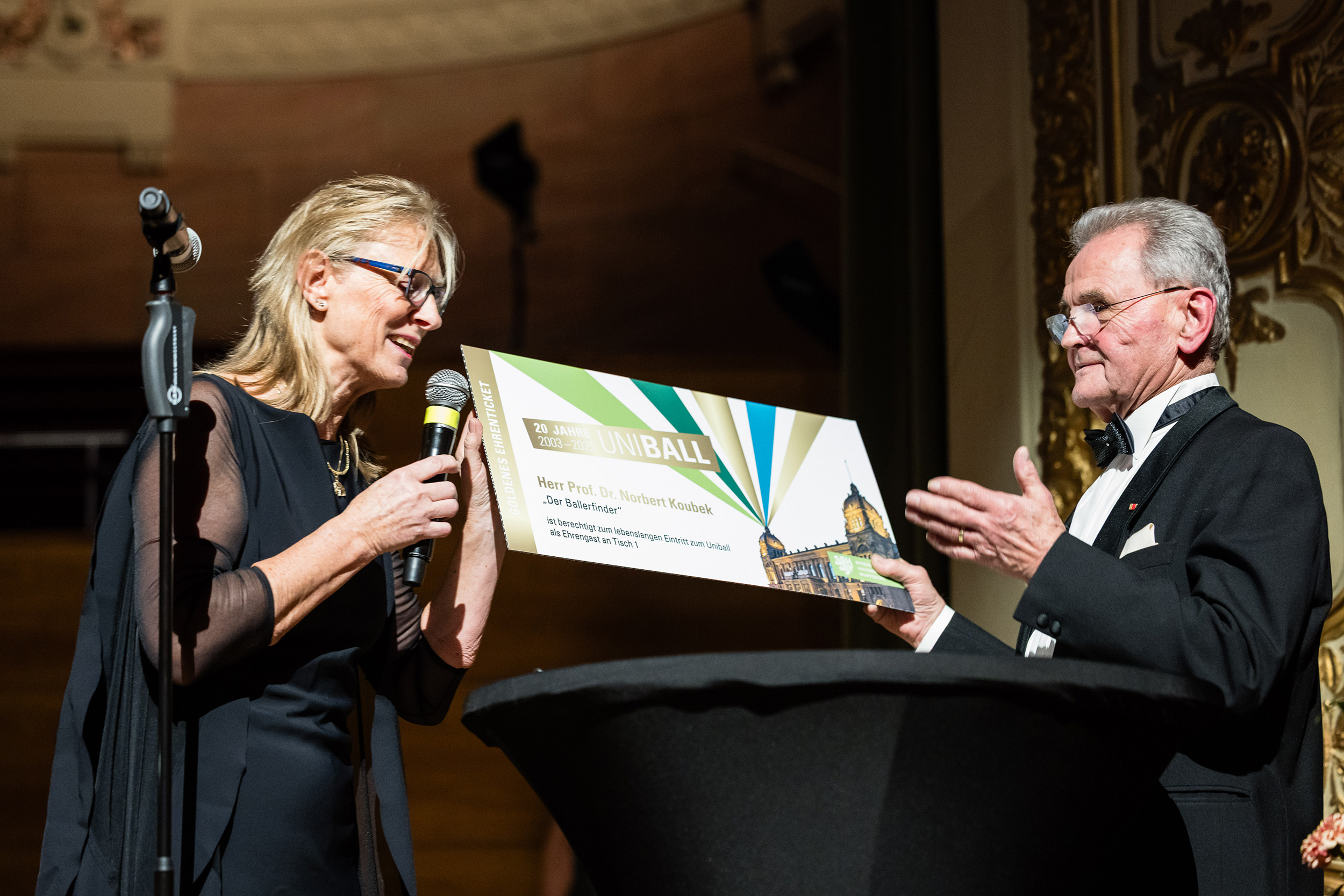 Auf die Zukunft der zentralen Absolventenfeier in diesem Format angesprochen, entgegnete Dr. Norbert Koubek: „Eine Gefahr sehe ich in einem möglichen Ausweichen zur digitalen KI, das würde die Substanz beschädigen“. Koubek erhielt dann als Auszeichnung das „Goldene Uniball-Ticket“.