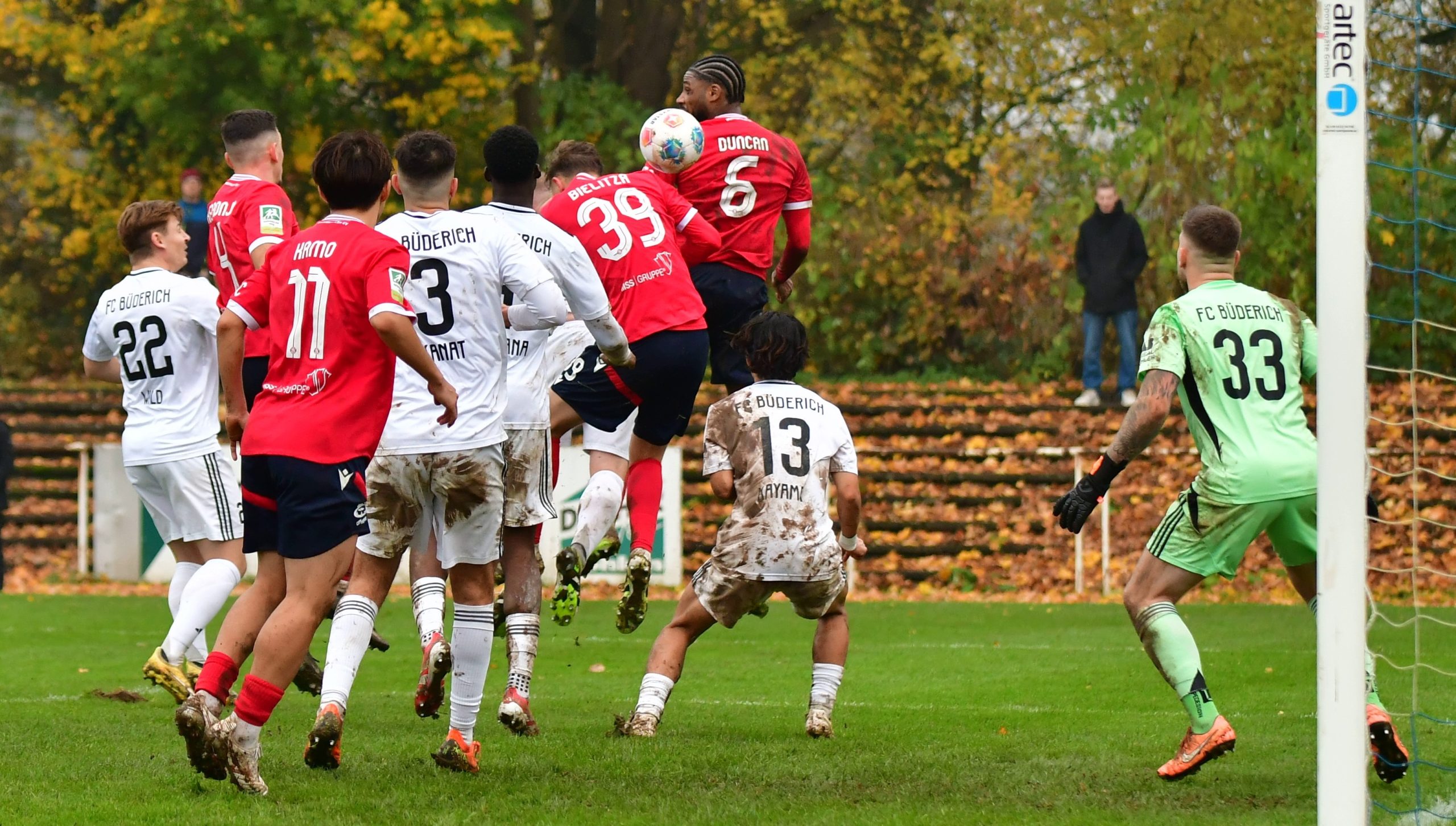 Eine der vielen Chancen, die der Wuppertaler SV beim Pokalfight in Büderich nicht nutzen konnte – © Jochen ClassenDer Regionalligist von der Wupper erhöhte den Druck, doch ein Tor wollte einfach nicht fallen. Die Angriffsversuche der Büdericher blieben harmlos – bis zur 95. Minute. Alle rechneten schon mit einer Verlängerung, da schlugen die Gastgeber eiskalt zu.
