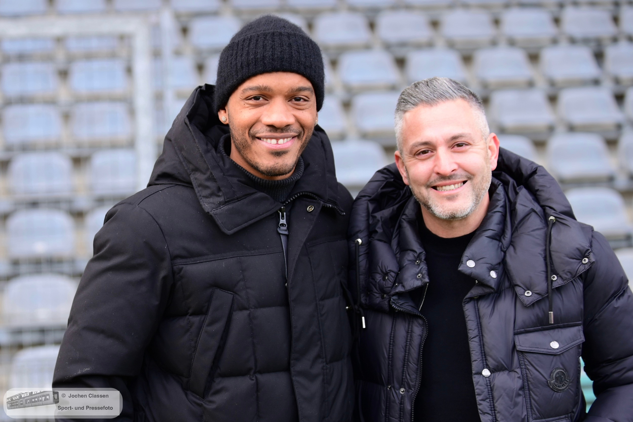 Feiern ein Wiedersehen: Ex-WSV-Stürmer Charlison Benschop, der jetzt bei der U23 der Fortuna unter Vertrag steht, und WSV-Sportdirektor Gaetano Manno – © Sportfotodienst / ClassenAls dann der an diesem Tage starke Lennard Wagemann am Rand des Strafraums zu Fall kam, gab Stock den dritten Elfmeter des Tages, diesmal für den WSV. Die Berechtigung konnte man auch hier durchaus anzweifeln. Eine späte Konzessions-Entscheidung? Aldin Dervisevic jedenfalls verwandelte den Strafstoß in Minute 78. zum 2:4.