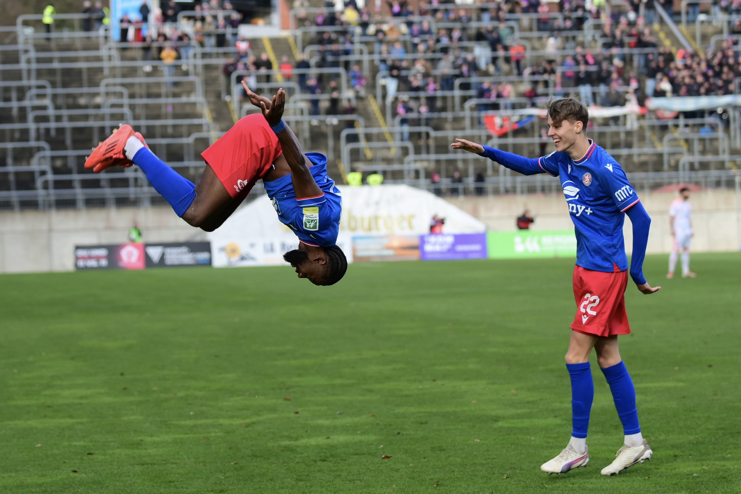 Seinen Treffer zum 1:0 nach 30 Sekunden feierte Torschütze Jeff-Denis Fehr mit einem akrobatischen Salto – rechts Levin Müller. Leider zu früh gefreut, wie der Ausgang des Spieles beweist – © Jochen ClassenEin Blitz-Start, der Selbstvertrauen hätte geben können. Doch der WSV sah sich jetzt erst recht einem angestachelten Gegner gegenüber, der die Offensive suchte, jedoch zunächst ohne zählbares Ergebnis. Die Möglichkeiten für die Gastgeber auf 2:0 zu erhöhen, waren da, doch Levin Müllers Schuss verfehlte das Ziel (25.). Unerwartet dann der Ausgleich: Ein sehenswertes Zuspiel des 35jährigen Fortuna-Routiniers Danny Latza nutzte Deniz Bindemann freistehend vor WSV-Keeper Luyambula in Minute 27 zum 1:1-Ausgleich.