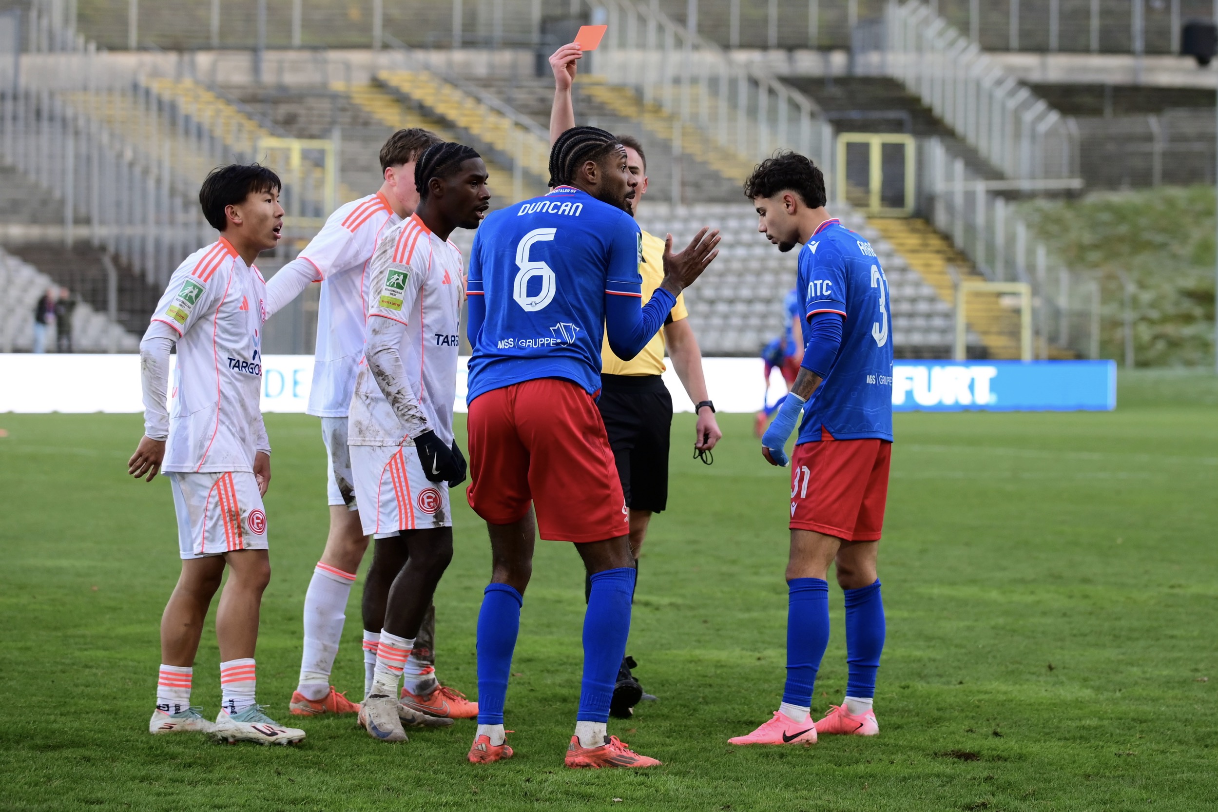WSV-Spieler Dominic Duncan (Nr. 6) sieht nach einem groben Foul im Mittelfeld die Rote Karte – © Jochen ClassenMit solchen Qualitäten wären vermutlich auch die in Rot-Blau agierenden Gastgeber erfolgreicher gewesen. Jedenfalls scheiterten Hans-Juraj Hartmann, Levin Müller , Ronay Arabaci oder Daiki Kamo in aussichtsreichen Positionen.