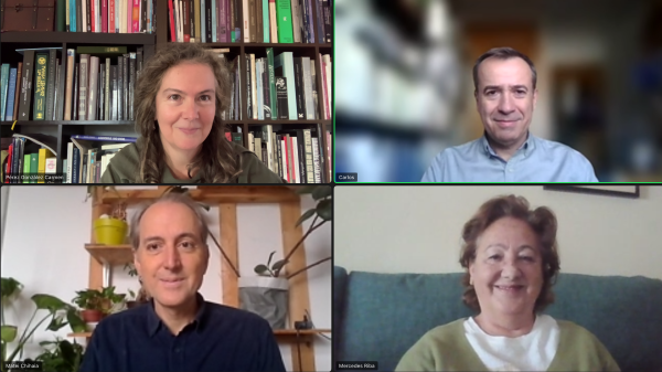 Dr. Carmen Pérez González (Wissenschafts- und Technikgeschichte), Prof. Carlos Sanz Díaz (Universidad Complutense de Madrid), Prof. Dr. Matei Chihaia (Romanistik), Mercedes Riba Hernández (Schriftstellerin) – © Screenshot: GonzálezWerkszeitung „Spindel und Schützen“