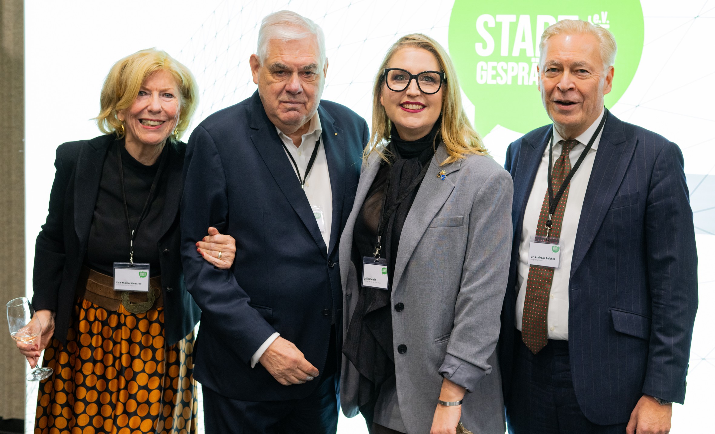 Genossen den sehr erfolgreichen Abend für Salon-Kultur sehr: Eva und Dr. Richard Kiessler (l.), Initiatoren der renommierten Netzwerk-Veranstaltung STADTGESPRÄCHE.ruhr, mit Julia Klewin, 2. Bürgermeisterin de Stadt Essen und Impulsgast Andreas Reichel (r.) – © Fotostudio Essen / Dr. Claudia PosernAndreas Reichel: „Wir können doch nicht die fossilen Kraftwerke, die zum Teil 50 Jahre alt sind, auf ewig am Leben halten. Die Energiewende ist ein gesellschaftlicher Auftrag, aber am Ende auch ein billiges Modell. Sie ist ja keine Idee von ein paar grünen Spinnern, sondern ein globaler Trend und wir haben die Chance als Ingenieurs-Nation vorne zu sein. Aber wir haben es zumindest phasenweise falsch gemacht haben, indem wir die Energiewende als einen deutschen Overkill betrieben, mit einem moralischen Impetus: Wir sind die moralisch Besten der Welt, wir machen das ganz schnell, koste es, was es wolle. Und das ist dann das Gegenteil von gut!“