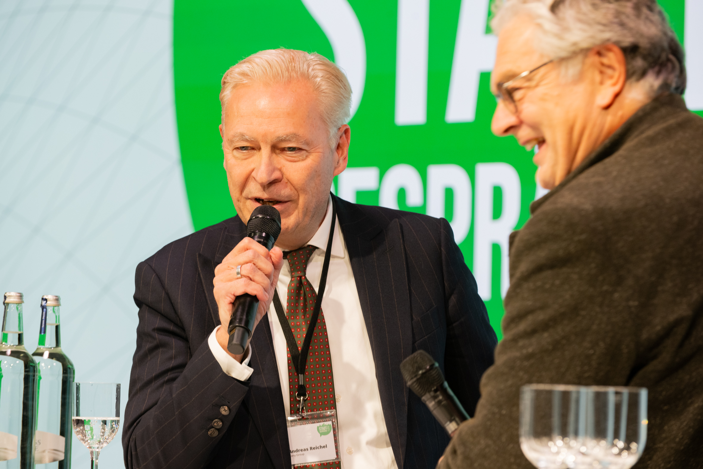 Interessanter kann ein Talk kaum sein: Impulsgast Andreas Reichel (l.) mit Moderator Jürgen Zurheide – © Fotostudio Essen – Dr. Claudia Posern„Was haben Sie gedacht, als Sie zum ersten Mal das Habecksche Heizungsgesetz gesehen haben?“, kam Moderator Jürgen Zurheide bei der renommierten Netzwerkveranstaltung STADTGESPRÄCHE.ruhr im Energie geladenen Gespräch mit STEAG-Vorstand und CEO der Energiegesellschaft STEAK-Iqony Andreas Reichel direkt auf den Punkt: „Ich war schon ziemlich erschrocken. Das war für mich ein Kipppunkt der Energiewende. Mit diesem Gesetz ist der Rückhalt für die Energiewende bei einer Mehrheit der deutschen Bevölkerung zusammengebrochen“, erstaunlich offene und klare Worte für einen Mann, der früher selbst in der Politik u.a. als FDP-Kreisvorsitzender der Stadt Köln, als Generalsekretär der Freien Demokraten NRW und als stellvertretender FDP-Landesvorsitzender aktiv war .