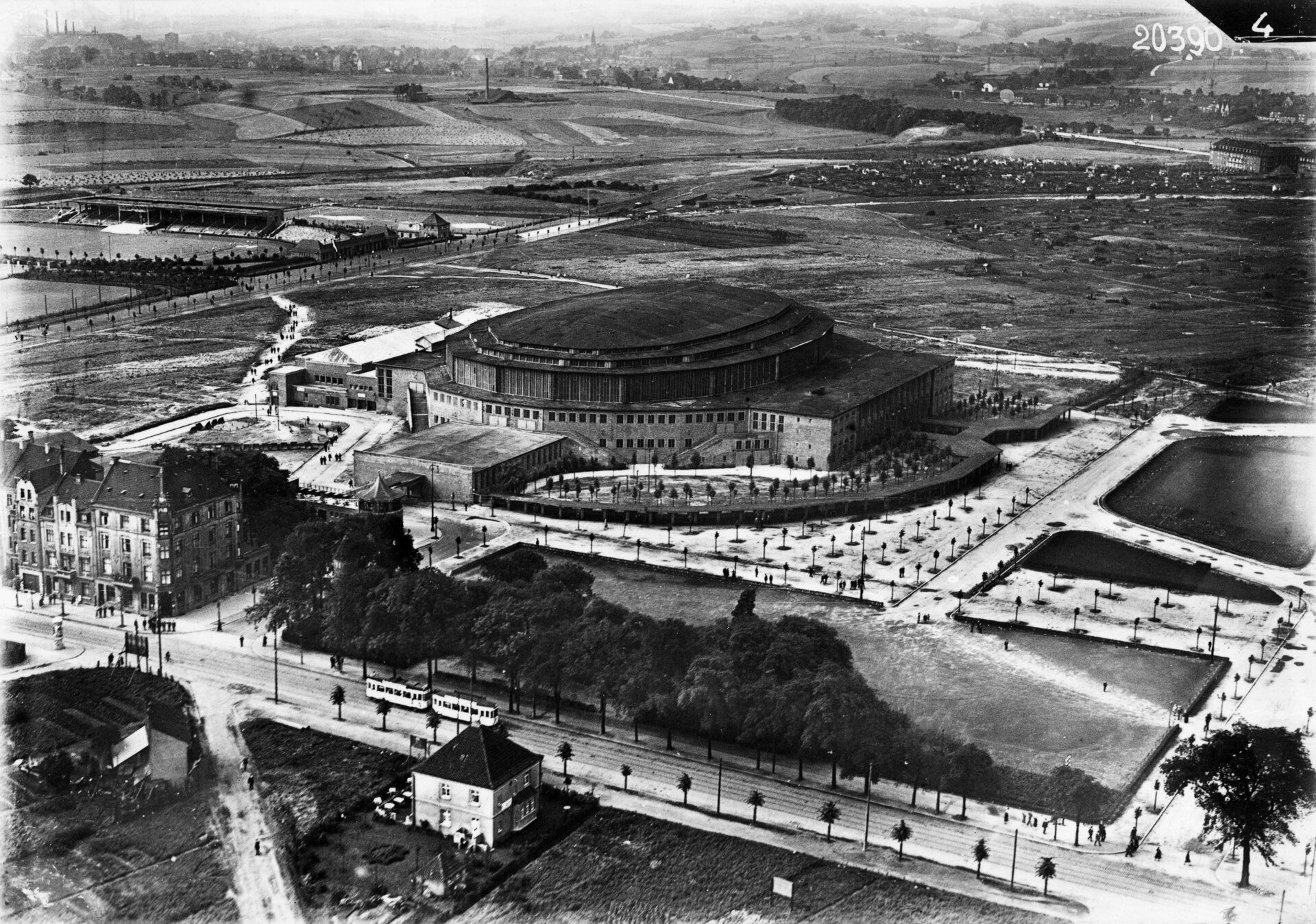 So sah die Dortmunder Westfalenhalle im Jahr 1927 aus – © dl-de/by-2-0Ähnlich verhielt es sich mit dem Anschrauben der Stahlverbindungsstücke, auf denen die spätere Dacheindeckung auflagerte – hier bewegten sie sich auf dünnen Trägern und das in einer Höhe von 20-25 Metern über dem Boden. Neben der sicherlich körperlich schweren Arbeit kam der Zeitdruck zum Schluss hinzu: Die Halle sollte nach dem Krieg schnell als Symbol des Wiederaufbaus und für Veranstaltungen bereitstehen. Die erste Veranstaltung war bereits für den 02. Februar 1952 angesetzt – nach 1,5 Jahren Bauzeit. Der Termin wurde eingehalten und es fand eine große Eröffnungsveranstaltung statt. Damit hatte Dortmund erneut eine beeindruckende freitragende Dachkonstruktion realisiert: technisch innovativ, architektonisch elegant und ein Symbol für den Fortschritt im Nachkriegsdeutschland. Oberbürgermeister Fritz Henßler nannte es damals zu Recht „eine Repräsentation der Leistungsfähigkeit der Dortmunder industriellen und gewerblichen Wirtschaft“.“