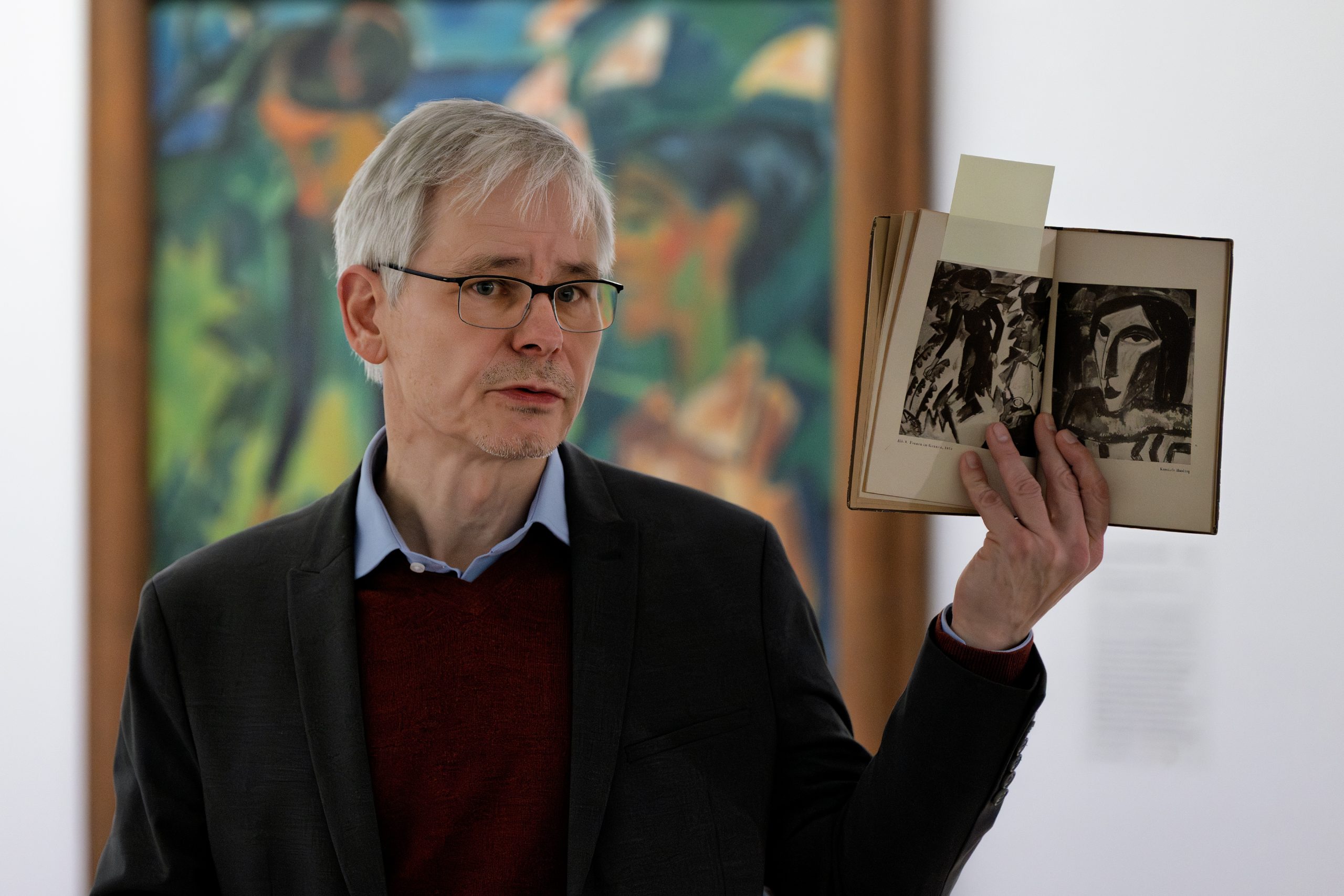 Museumsdirektor Dr. Roland Mönig mit einem Buch, in dem Karl Schmidt-Rottluffs Werg dokumentiert ist – © Ralf SilberkuhlMuseumsdirektor Dr. Roland Möning freut sich über den Verbleib des Kunstwerks und hält die erreichte Lösung für gerecht und fair. Der Kunst-Experte erklärte: „’Zwei Frauen (Frauen im Grünen)‘ ist über viele Jahrzehnte das einzige Gemälde von Karl Schmidt-Rottluff in der Wuppertaler Sammlung gewesen und spielt damit im Museumsbestand zur Künstlergruppe ‚Brücke‘ eine zentrale Rolle.“
