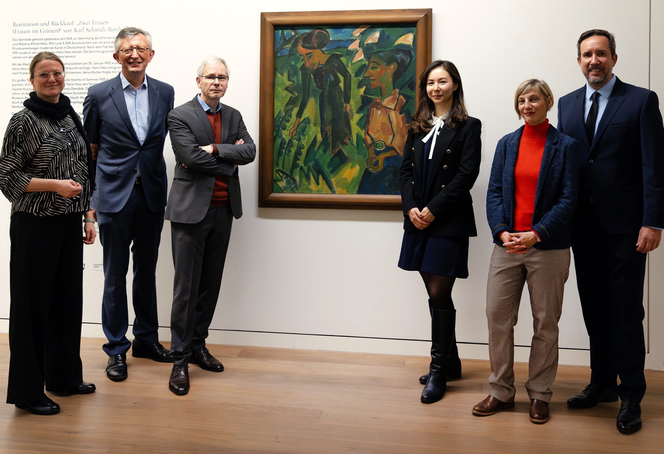 Vor Karl Schmidt-Rottluffs Werk „Zwei Frauen – (Frauen im Grünen)“: (v.l.) Kuratorin Anna Baumberger, Stadtdirektor Matthias Nocke, Museumsdirektor Dr. Roland Mönig, Chiruzu Kahl (Ernst von Siemens-Kunststiftung), Dr. Josephine Karg (Kulturstiftung der Länder) und Rechtsanwalt Julius Kaspar Niesert – © Ralf SilberkuhlDie Hintergründe der Rückhol-Aktion wurden am heutigen Montag (01.12.) in einer Pressekonferenz erläutert. Das expressionistische Ölgemälde hatte Karl Schmidt-Rottluff 1914 geschaffen. Es befand sich anschliessend in Besitz der von Nationalsozialisten verfolgten jüdischen Familie Hess. Die Nazis eigneten sich das Bild durch sogenannten „Kunstraub“ an und es landete schließlich auf Umwegen in der Kunstsammlung des von der Heydt-Museums.
