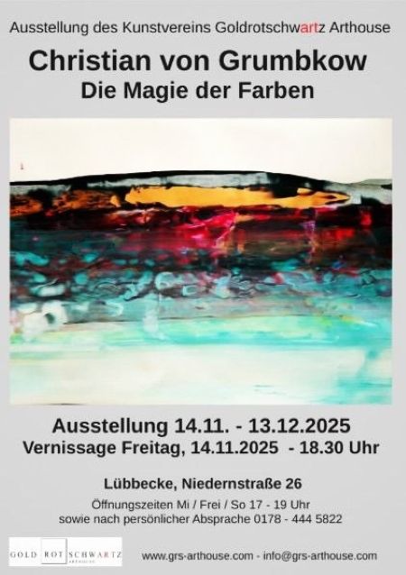 Das Plakat zur Ausstellung „Die Magie der Farben“ im Goldrotschwarz Arthouse in Lübbecke – © Kunstverein Goldrotschwarz ArthouseInsgesamt waren Werke des sympathischen Wuppertalers bereits bei über 300 Ausstellungen weltweit vertreten. Bis zum 13. Dezember können von Grumbkow-Fans noch seine Ausstellung „Die Magie der Farben“ in der Galerie „Goldrotschwarz Arthouse“ in Lübbecke besuchen. Außerdem hat der Künstler sein Atelier im wunderschönen Schloß Lüntenbeck während der beiden Weihnachtsmarkt-Wochenenden (05.-07.12. & 12.-14.12) geöffnet. Der romantische Weihnachtsmarkt im idyllischen Schlosshof ist ein Glanzlicht weit über die Grenzen Wuppertal hinaus.
