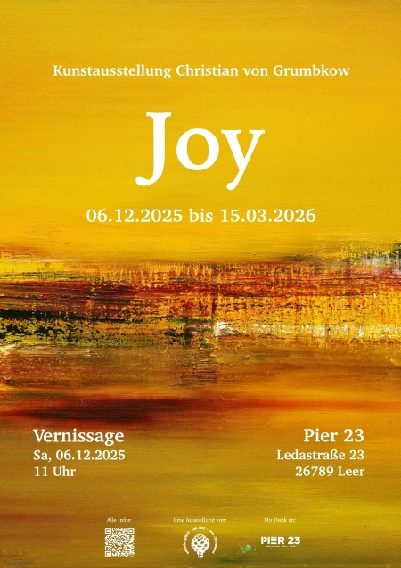 Plakat zur Ausstellung „Joy“ in der Galerie „Pier 23“ in Leer – © Pier 23Den attraktiven Kunst-Katalog „Farbwelten im Wandel“, der aus Anlass der hochkarätigen Ausstellung „Farbwelten im Wandel“ im Kunst-Ausstellungs-Tempel Gut Altenkamp in Papenburg, der Heimat der weltberühmten Meyer-Werft, veröffentlicht wurde. Sie können den Hochglanz-Katalog bestellen bestellen unter: http://www.grumbkow-colors.de