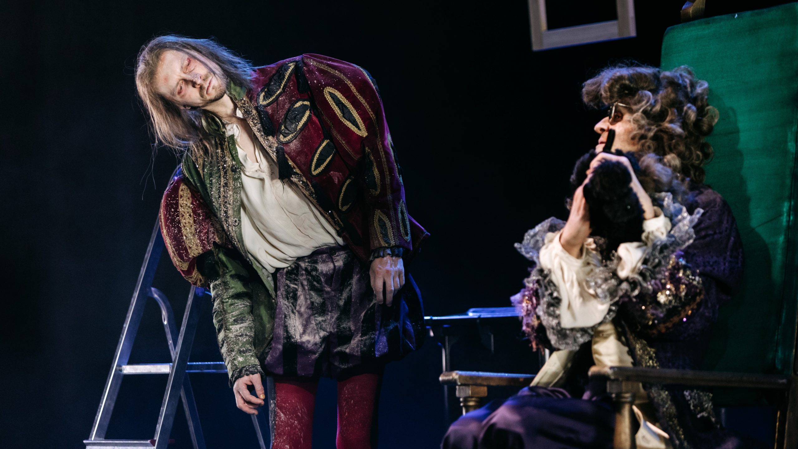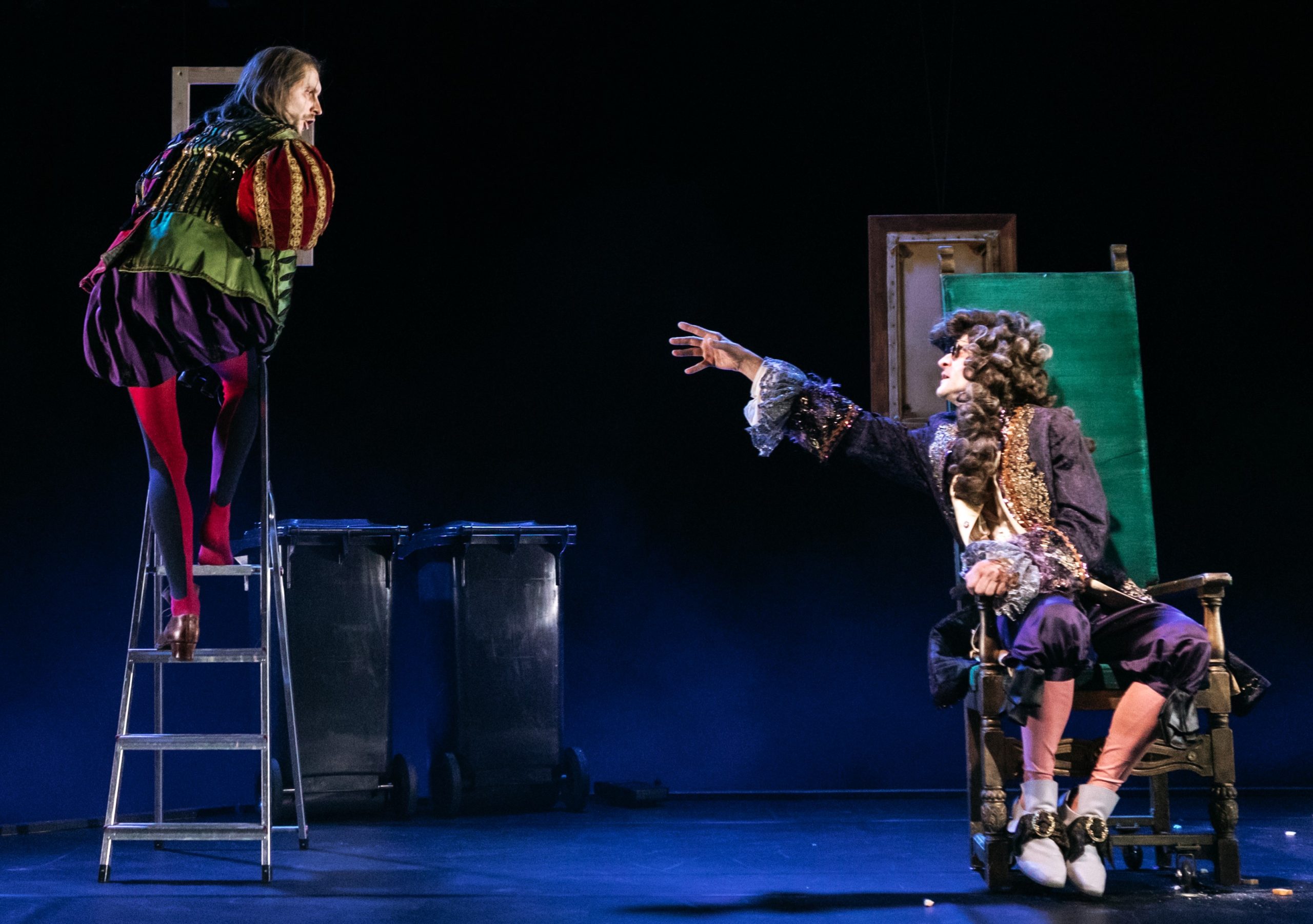 Das „Endspiel“ handelt von dem blinden, gelähmten Hamm (Thomas Braus) und seinem Diener Clov (Kevin Wilke), die letzten Überlebenden einer unbestimmten Katastrophe, die auf das unabwendbare Ende warten. Sie leben in einem kahlen Unterschlupf und warten halb sehnsüchtig, halb ängstlich auf das absolute Ende. In Kallmeyers Inszenierung ist die Bühne karg (Bühne & Kostüme Silke Rekord), bis auf den Stuhl, auf dem Hamm sitzt und einer Klappleiter, die Clov hin und wieder nutzt, um in die Ferne zu schauen. Mehr gibt es nicht.