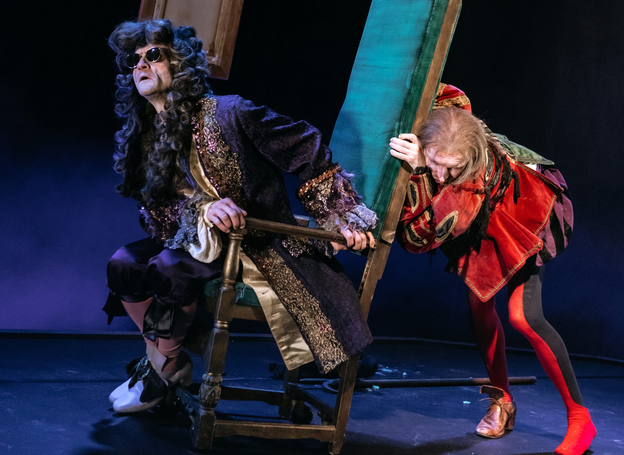 Blind, gelähmt, verbittert, bösartig: Hamm (l. -Thomas Braus) macht seinem Diener Clov (Kevin Wilke) das Leben zur Hölle – © Dana SchmidtTrotz des ernsten Themas ist das Stück voller bitterböser, zynischer Komik. „Man lacht darüber, solange es neu ist, aber es ist immer dasselbe“. Im finalen Stadium dann: „Ich sehe mein Licht, das stirbt. Es gibt keine Natur mehr. Die Natur hat uns vergessen“.