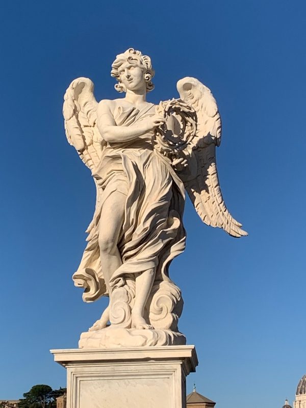 Berniniengel auf der Engelsbrücke in Rom – © UniService Third MissionEinen Unterschied sieht der Historiker in der eher etwas gezähmteren, höflicheren und höfischeren Art des Künstlers Bernini und sagt: „Er wusste sich auf dem glatten Parkett der Aristokratie im Umfeld des Papstes mit einiger Sicherheit, wenn auch immer wieder mit gelegentlichen Wutausbrüchen, aber im Großen und Ganzen gesellschaftlich akzeptiert, ja sogar bejubelt, zu bewegen. Michelangelo war viel eigenbrötlerischer, noch viel mehr eben nur auf seine Kunst fixiert.“
