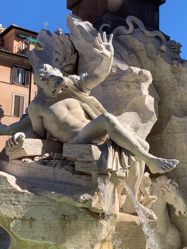 Detail des Vierströmebrunnens von Bernini – © UniService Third MissionUnd auch im Ausland war der ewige Römer nicht recht erfolgreich. Im Alter von 67 Jahren lieh ihn der Papst erstmalig an Frankreich aus. Von dort kehrte er sehr deprimiert wieder nach Rom zurück, denn keiner seiner Entwürfe für den Louvre, die er dem französischen König liefern sollte, wurde verwirklicht.