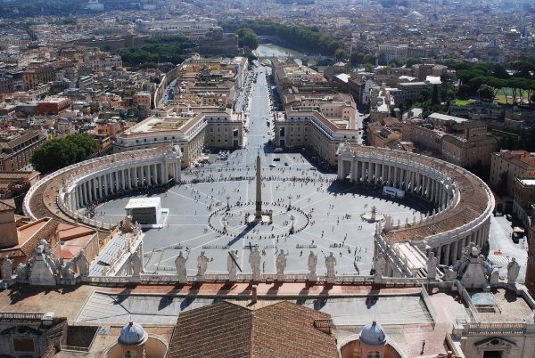 Bernini prägte die Gestaltung des Petersplatzes im Vatikan, welcher zuvor nur ein trapezförmiger Bereich war, der zum Petersdom führte. „Das erreichte er“, erklärt der Historiker, „indem er, wie ja noch heute jeder Rombesucher sehen kann und wie man jüngst wieder bei Papsttod, Konklave und Papstwahl sehen konnte, die Hauptkirche der katholischen Christenheit durch seine Platzgestaltung mit dem städtebaulichen Kontext in Beziehung setzte. Die berühmten Kolonnaden, die den Platz einfassen und gleichzeitig den Zugang zum Petersdom regulieren, sind weltberühmt und omnipräsent.“ Bernini schuf dort zwischen 1656 und 1667 ein imposantes elliptisches Bauwerk mit 284 dorischen Säulen in vier Reihen, das den Petersplatz umrahmt.