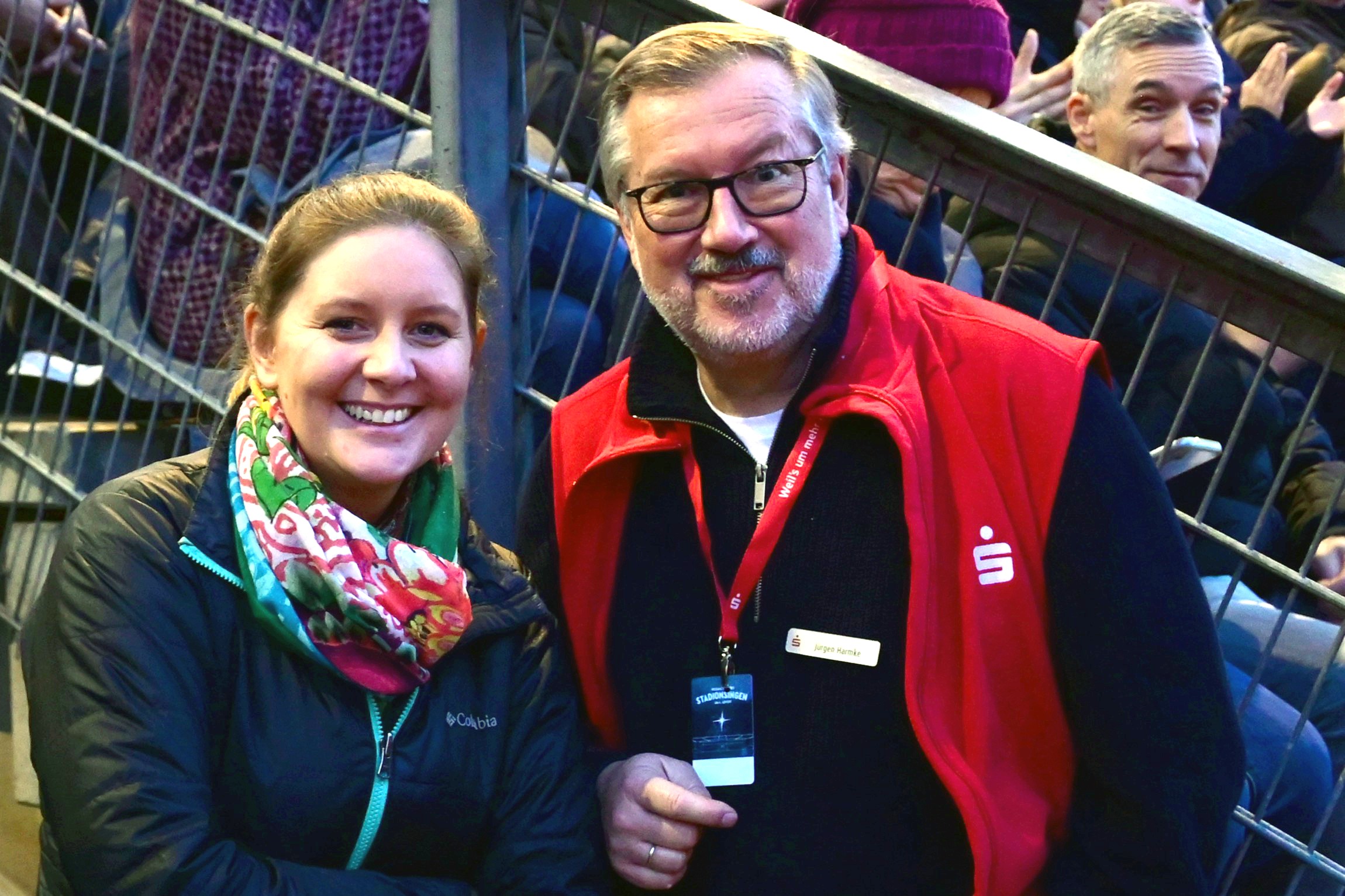 Führten gefühlvoll und professionell zugleich durch das Programm des ersten „Weihnachtsstadionsingens“: Moderatoren-Team Jasmin und Jens Voss von Radio Wuppertal – © Jochen ClassenBesinnliche und mit viel Beifall bedachte Worte kamen von Oberbürgermeisterin Miriam Scherff, die die Weihnachtsgeschichte vertrug. Pfarrer Jochen Denker (Ronsdorf) hielt eine kurze, aber prägnante 90-Sekunden-Predigt, die gut zum lockeren, aber feierlichen Rahmen passte. “Der Friede kann gewinnen, Gott sei Dank, in dieser gespaltenen Welt“, so sein Schlußsatz.