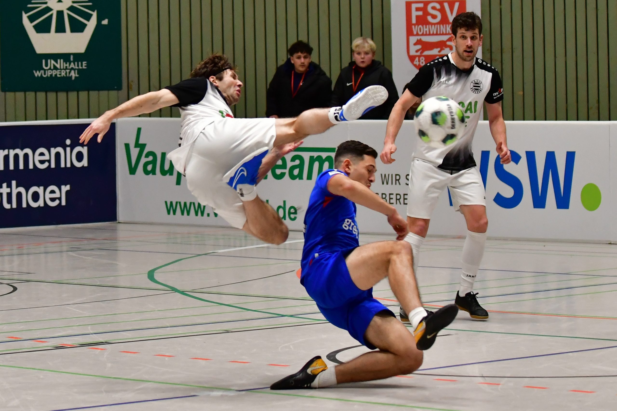 Artistische Flug-Einlage beim Halbfinalspiel des TSV Ronsdorf gegen den Wuppertaler SV, das der Regionalligist am Ende knapp mit 1:0 für sich entschied – © Jochen ClassenDie Vorrunde wurde in vier Gruppen á vier Clubs gespielt. In der Gruppe A setzten sich der FSV Vohwinkel (9 Punkte) und SC Viktoria Rott (6) durch, TuS Grün-Weiß Wuppertal (3) und der SC Uellendahl (0) schieden aus.