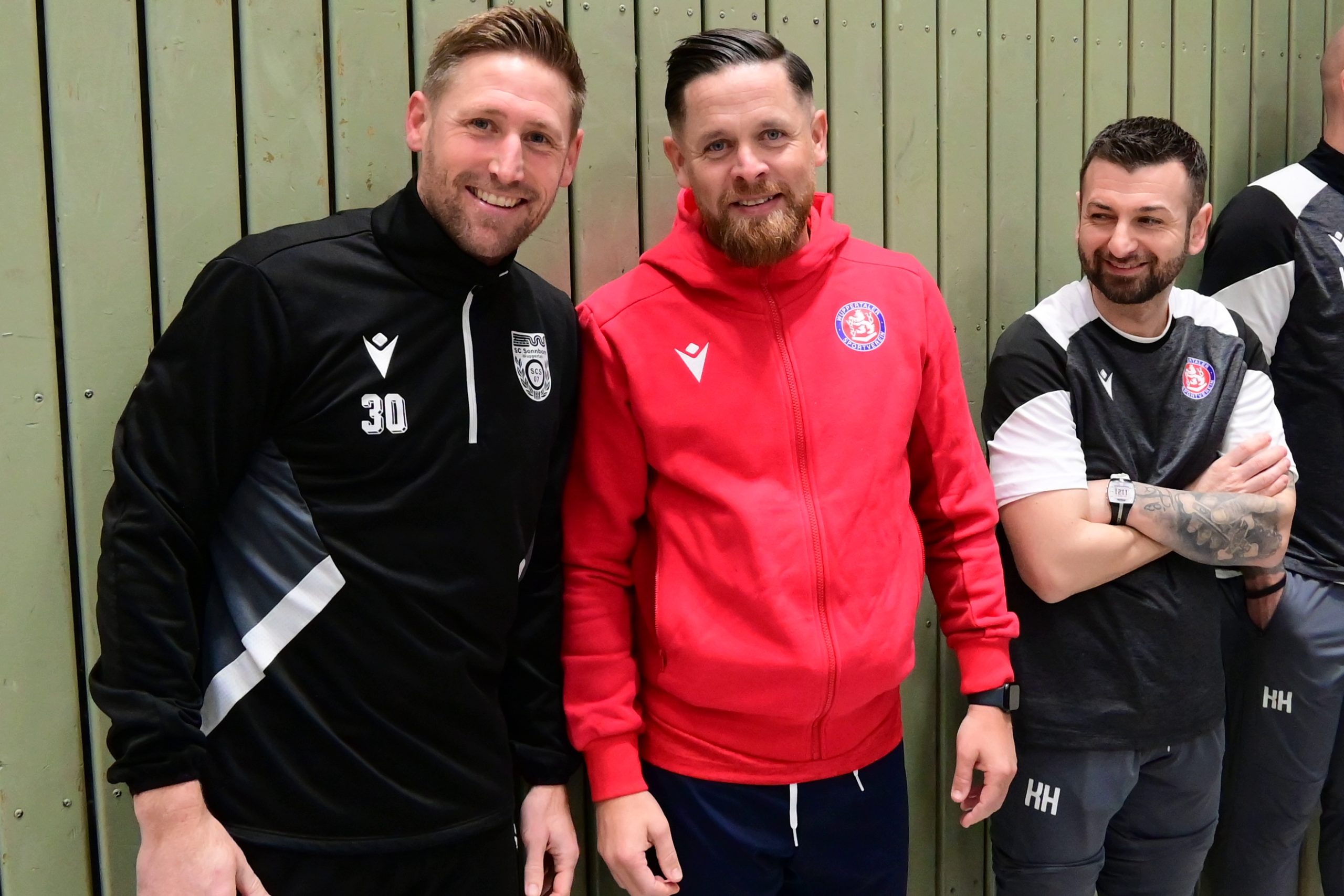 Der neue WSV-Cheftrainer Mike Wunderlich (M.) mit seinem Co-Trainer Kevin Rodrigues Pires (r.) und Björn Kluft (35), Ex-Profi u.a. bei Eintracht Braunschweig, Rot-Weiß Essen und Erzgebirge Aue, der jetzt im Herbst seiner Karriere die Fäden im Mittelfeld des Wuppertaler Amateurvereins SC Sonnborn zieht, aktuell Tabellenführer in der Kreisliga A Niederberg – © Jochen ClassenWeiter mit:
