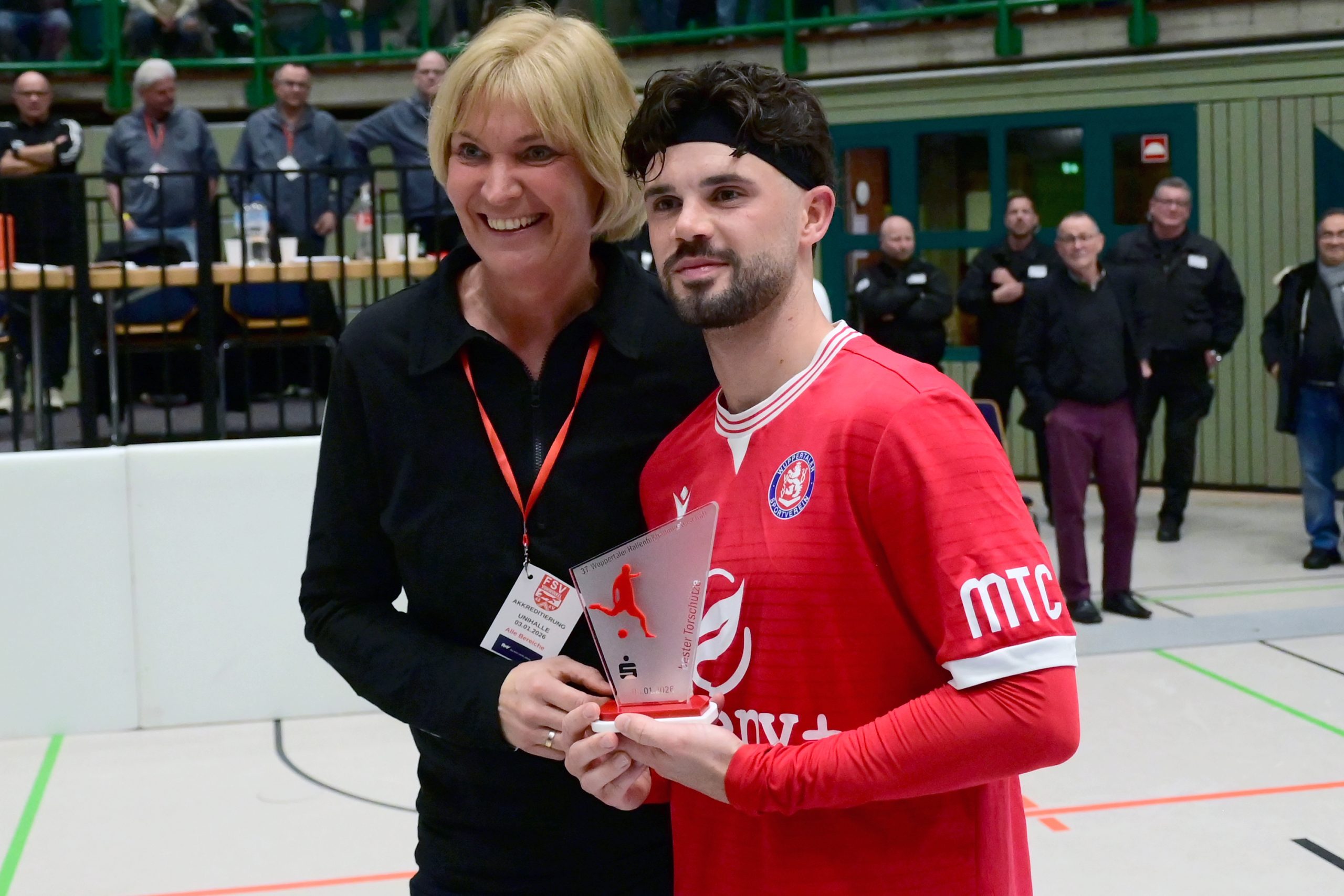 Wuppertals Sportamtsleiterin Alexandra Szlagowski zeichnete Vincent Schaub, Stürmer des Regionalligisten Wuppertaler SV, als besten Torschützen des Turniers um die Wuppertaler Stadtmeisterschaft im Hallenfußball aus. Er hatte in den sechs Partien, in denen er auf dem Feld stand, insgesamt siebenmal getroffen. Eine tolle Ausbeute und sicher auch ein Motivationsschub für die anstehenden, wichtigen Meisterschaftsspiele in der Regionalliga West, in denen es für das Wuppertaler Fußball-Aushängeschild nicht nur um den Klassenerhalt in Deutschlands vierthöchster Fußball-Liga geht, sondern sogar um die nackte Existenz des Traditionsvereins – © Jochen Classen