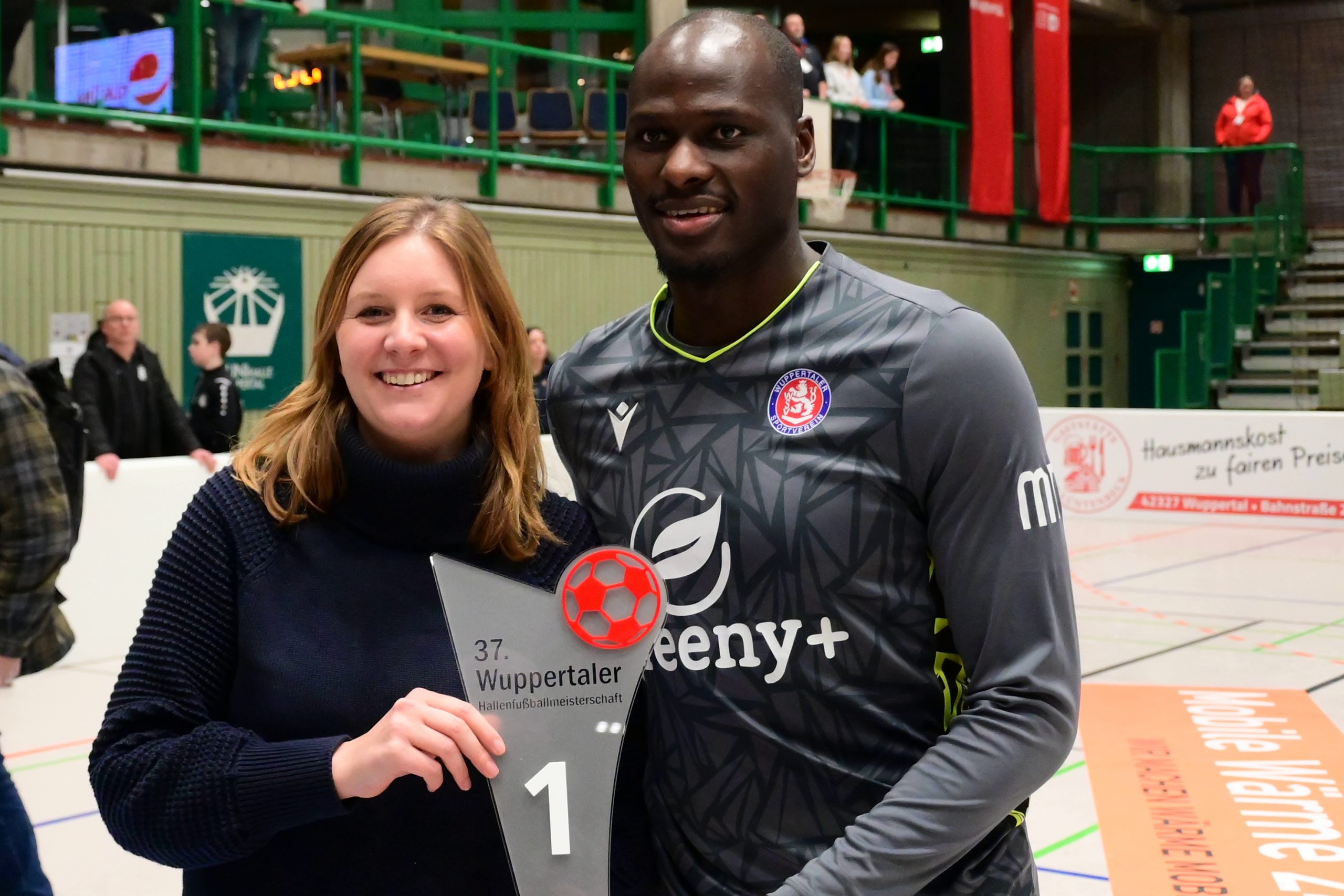 Wuppertals Oberbürgermeisterin Miriam Scherff übergab Michael Luyambula, Torhüter und Kapitän des Fußball-Regionalligisten Wuppertaler SV, den Siegerpokal der 37. Stadtmeisterschaften im Hallenfußball – © Jochen ClassenDie beiden Halbfinale gingen so aus: Der TSV Vohwinkel besiegte den SC Sonnborn haushoch mit 7:0. Der TSV Ronsdorf musste sich gegen den Turnierfavoriten Wuppertaler SV knapp mit 0:1 geschlagen geben.