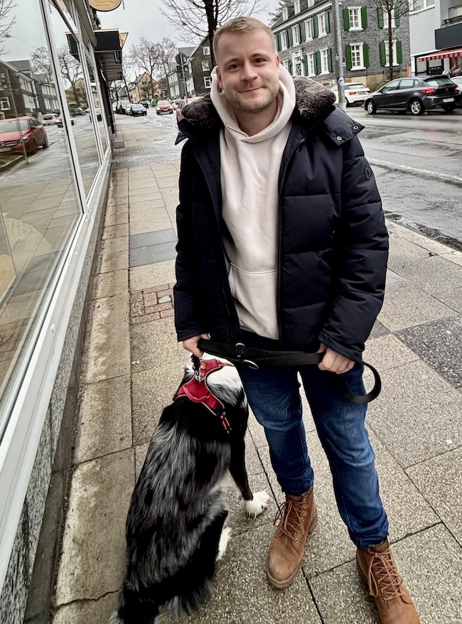 Wenn er nicht gerade beruflich auf Reisen ist, sind Sportjournalist Fabian Breuer und sein Hund Anton unzertrennlich – © Siegfried JähneArtikel über den Königs-Tranfer von Bayern München, die Super-Star Harry Kane von den Tottenham Hotspurts verpflichteten, „liveticker“ in bundesliga.de über das Fußball EM-Finale 2024 und das Champions League Finale Dortmund gegen Real Madrid gehören seither zu Fabian Breuers beindruckenden Referenzen. Seine Vielseitigkeit stellte er auch unter Beweis, als er in lokalen Medien sachkundig über Rollhockey, dem Volkslauf oder über die in Wuppertal geplante BUGA berichtete.