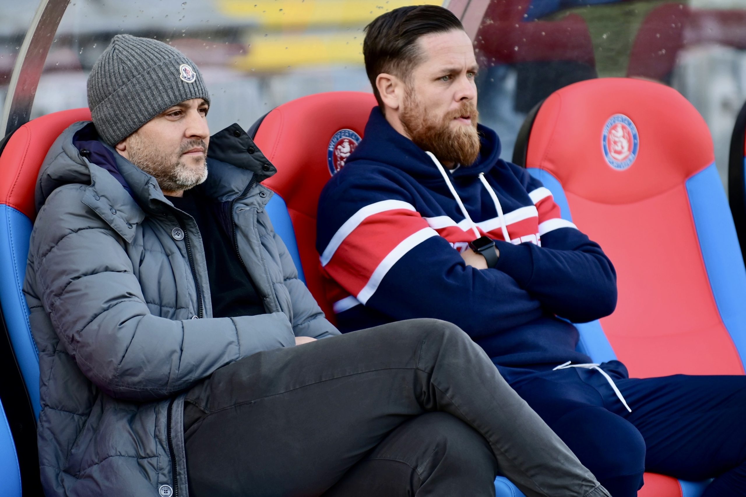 Ein Foto, das Bände spricht: WSV-Sportdirektor Gaetano Manno (l.) und der neue Cheftrainer Mike Wunderlich müssen fassungslos zusehen, wie ihre Mannschaft gegen das Tabellenschlusslicht Velbert verliert – © Sportfotodienst / Jochen ClassenUnter den 2.110 Zuschauern befanden sich aufgrund des freien Eintritts rund 300 Kinder und Jugendliche. Es hätten freilich deutlich mehr sein können, wenn es nicht im Vorfeld zu Fehlinformationen zu den Eintrittspreisen gekommen wäre. Nach Darstellung der Velberter Fan-Szene „Blaue Löwen“ sei man geschlossen nicht nach Wuppertal gereist, weil sie einer massiven Fehlinformation zu den Eintrittspreise von 23 € bzw. 19 €, statt der tatsächlichen 13 € bzw. 10 € aufgesessen seien.