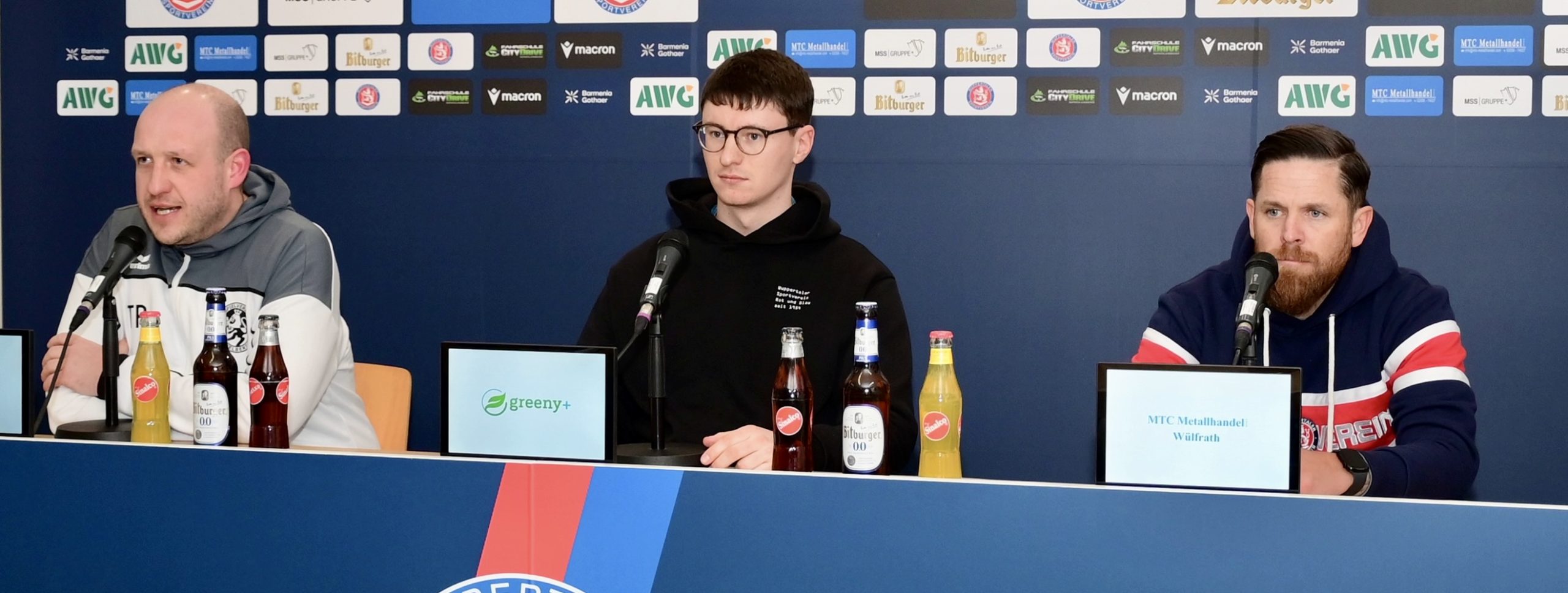 Lange Gesichter bei der Pressekonferenz nach dem Spiel – zumindest auf Wuppertaler Seite: Cheftrainer Mike Wunderlich (r.) und Stadionsprecher Jonas Jütz (M.). Velberts Trainer Komorowski (l.) konnte dagegen mehr aus zufrieden sein – © Sportfotodienst / Jochen ClassenWuppertaler SV – SSVg Velbert 0:1 (0:0)