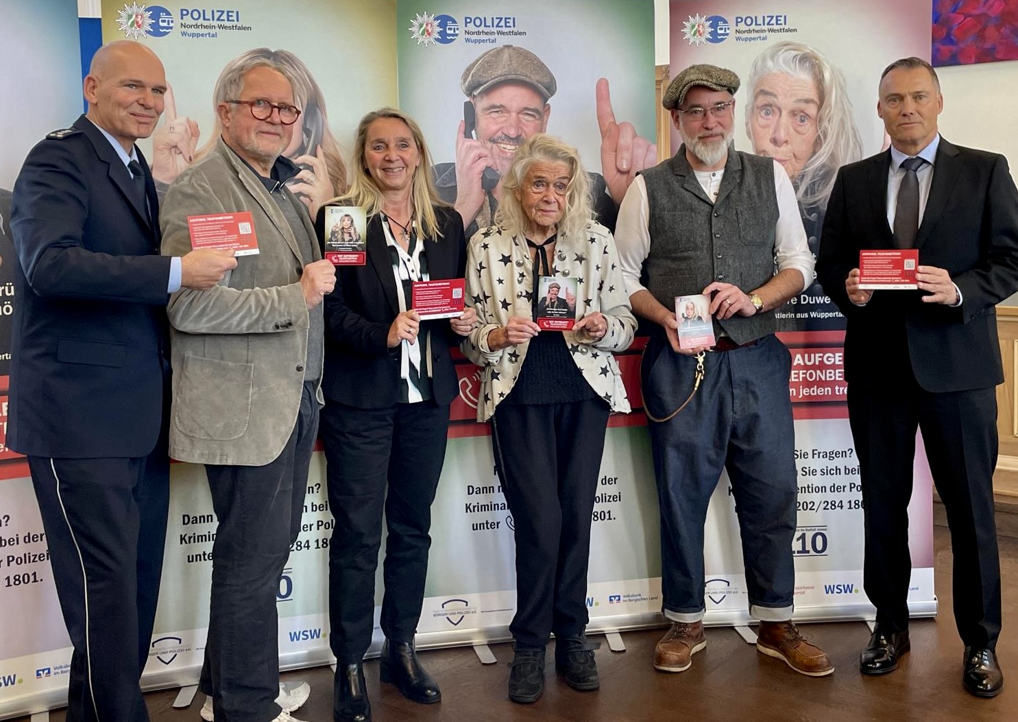Die bekannte Wuppertaler Schauspielerin Lore Duwe auf dem Plakat der Polizei-Kampagne „Gut aufgelegt“ – © Polizei WuppertalIm großen Saal des Polizeipräsidiums haben sich jetzt die Teilnehmer der Kampagne zu gemeinsamen Foto getroffen: „Tatort“-Kommissar Harald Krassnitzer, die TV-Moderatorin Panagiota Petridou, der Arzt, Moderator und Musiker Heinz-Wilhelm „Doc“ Esser sowie Polizei-Pressestellen-Leiter Sascha Kresta, Kriminal-Hauptkommissarin Marion Hedtmann, Hauptkommissar Michael Schroer und Wuppertals Polizeipräsident Marcus Röhrl.