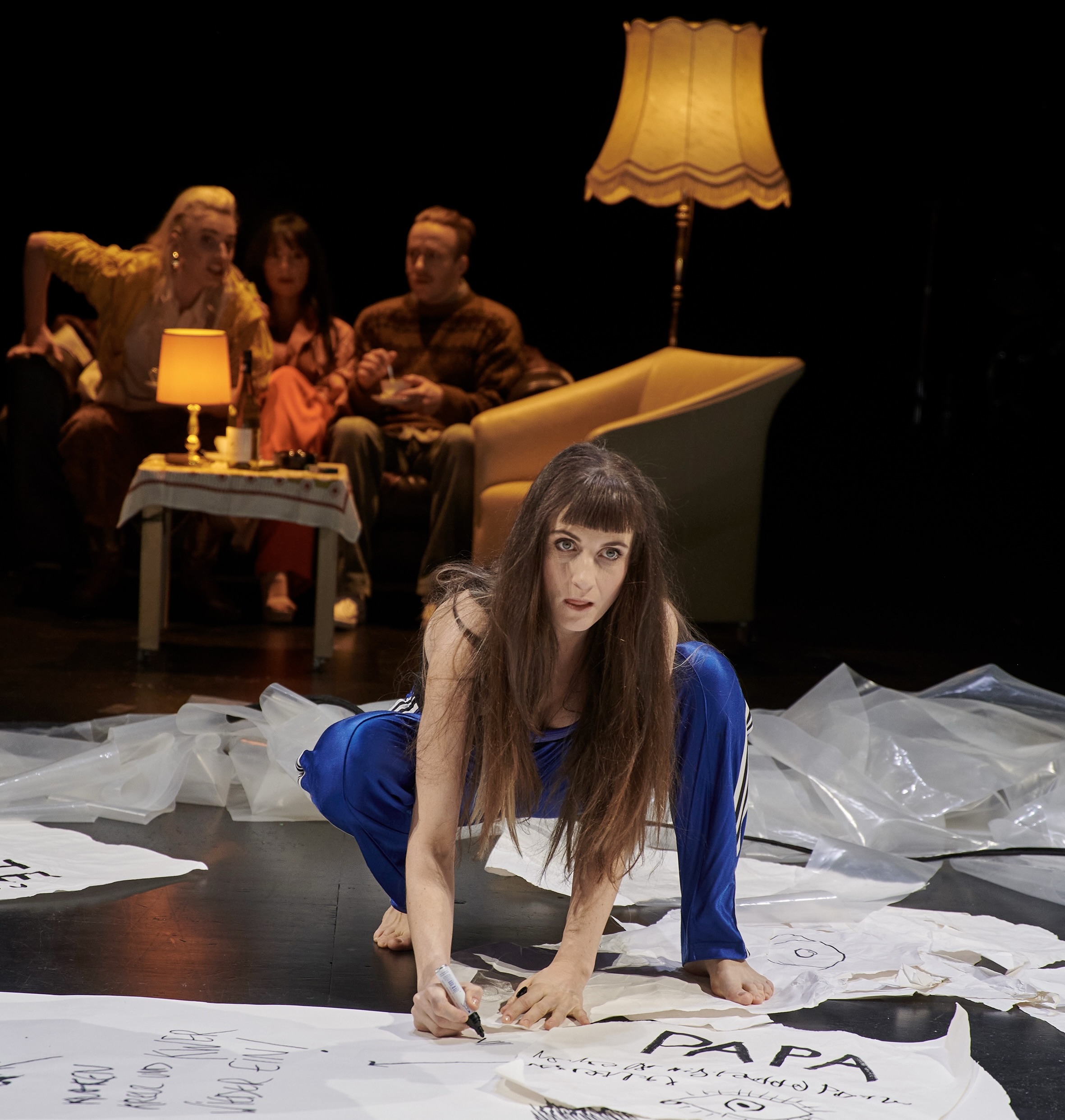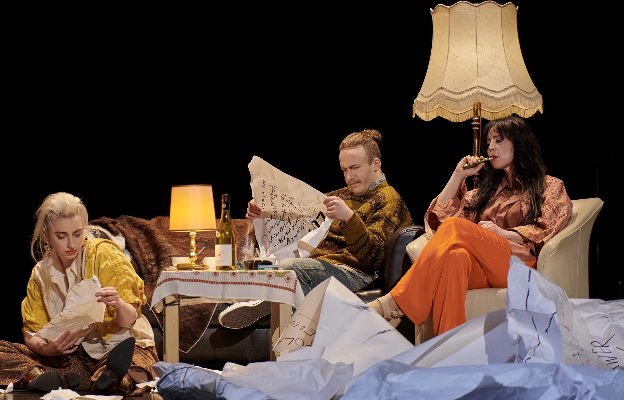 In trauter Wohnzimmer-Atmosphäre: (v.l.) Paula Püschel, Konstantin Rickert und Silvia Munzón López) – © Björn HickmannNicht beherrschbare Mächte