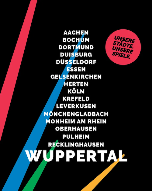 Das offizielle Bewerbungs-Plakat – © Land NRWZwei denkbare Austragungsorte sind mit dem Stadion am Zoo sowie der Wuppertaler Schwimmoper benannt, die beide für Nachhaltigkeit stünden, da es diese beiden Austragungsorte bereits gebe und in NRW gut erreichbar seien. Sie müssten also nicht mit großem Aufwand irgendwo errichtet werden. Einzig das olympische Leichtathletik-Stadion und das umgebende olympische Dorf, die Herzkammer der Spiele, sollen in der „Leading City Köln“ neu gebaut werden, so die NRW-Oympia-Bewerbung als Ganzes. Beide Wuppertaler Anlagen seien zudem auch spektakulär: Sowohl das Stadion am Zoo, aber vor allem die Schwimmoper, böten außergewöhnliche Architektur und stehen unter Denkmalschutz.