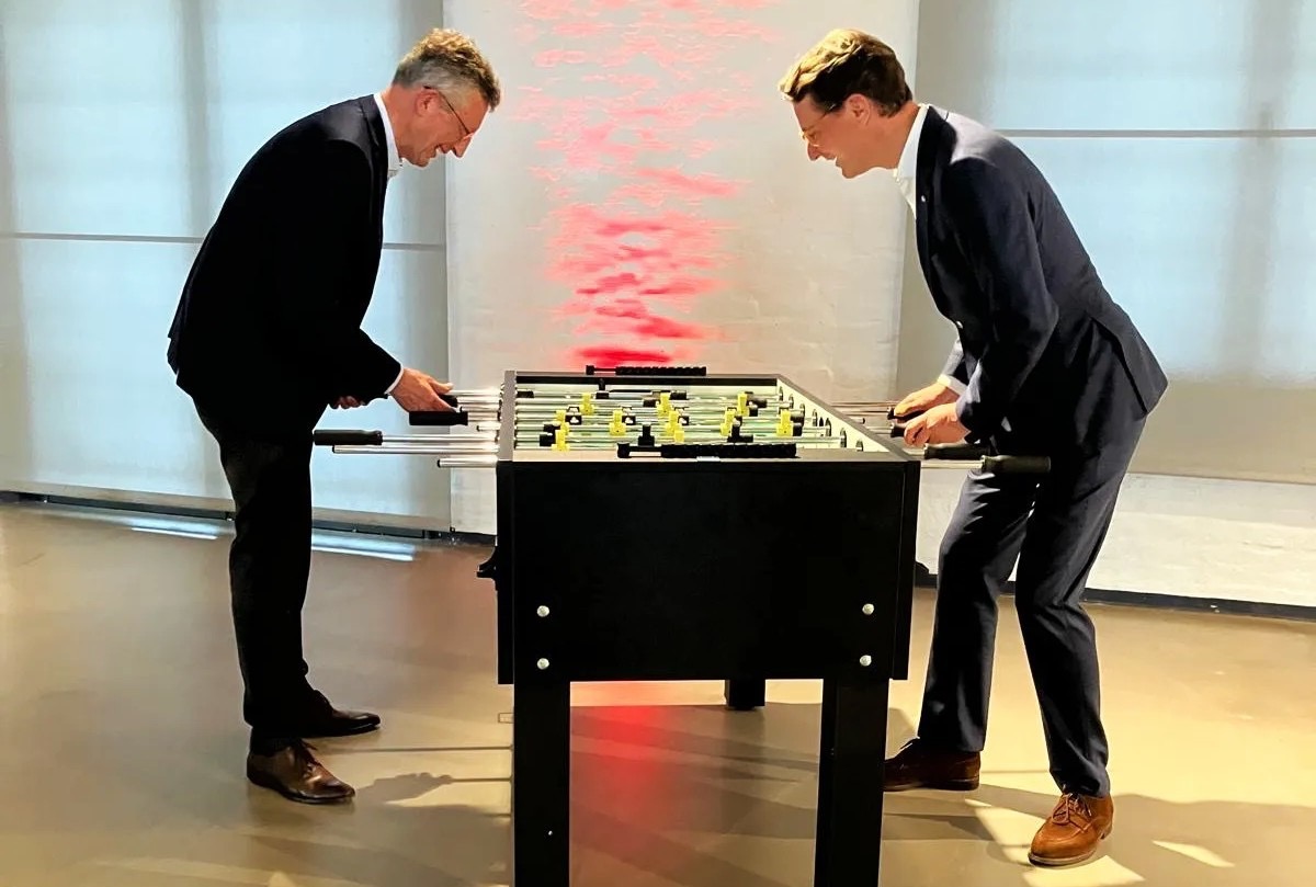 Gönnten sich ein kurzes Kicker-Match am Rande des Olympia-Planungs-Meetings: NRW-Ministerpräsident Hendrik Wüst (r.) und Wuppertals Sport-Dezernent Matthias Nocke – © Stadt WuppertalThomas Riedel weiter: „Gleichzeitig stoßen die Spiele durch Investitionen in Verkehr, Sportstätten und öffentliche Infrastruktur langfristige Entwicklungen an – davon profitieren nicht nur Sportfans, sondern alle Menschen vor Ort. Beim Gedanken daran, dass Wuppertal Teil dieser Vision sein kann und als möglicher Austragungsort im Gespräch ist, leuchten meine Augen so stark wie die Flamme der Fackel, die ich 2010 in Vancouver tragen durfte.“