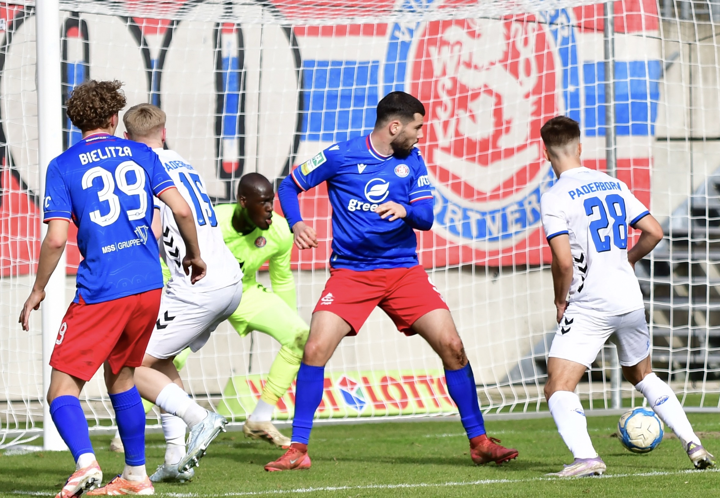 Und schon wieder klingelte es im WSV-Tor. Torhüter Luyambula und seine Vorderleute Bielitza und Dervisievic (M.) konnten den Paderborner Treffer nicht verhindern – © Sportfotodienst Wuppertal / Jochen ClassenDanach kam im Stadion am Zoo endlich auch so etwas wie Stimmung auf, nicht aber die erhoffte Aufholjagd. Im Gegenteil: Der lange verletzungsbedingt fehlende Mittelfeldspieler Semir Saric wurde zu einer Enttäuschung, als er in der 78. Minute eingewechselt, sich nach nur sechs Minuten übermotiviert ein völlig überflüssiges Foul leistete, für die er „Gelb“ sah. Der folgende Freistoß führte durch Kevin Krumme per Kopfball zum dritten Treffer für die Gäste. Es war die endgültige Entscheidung.