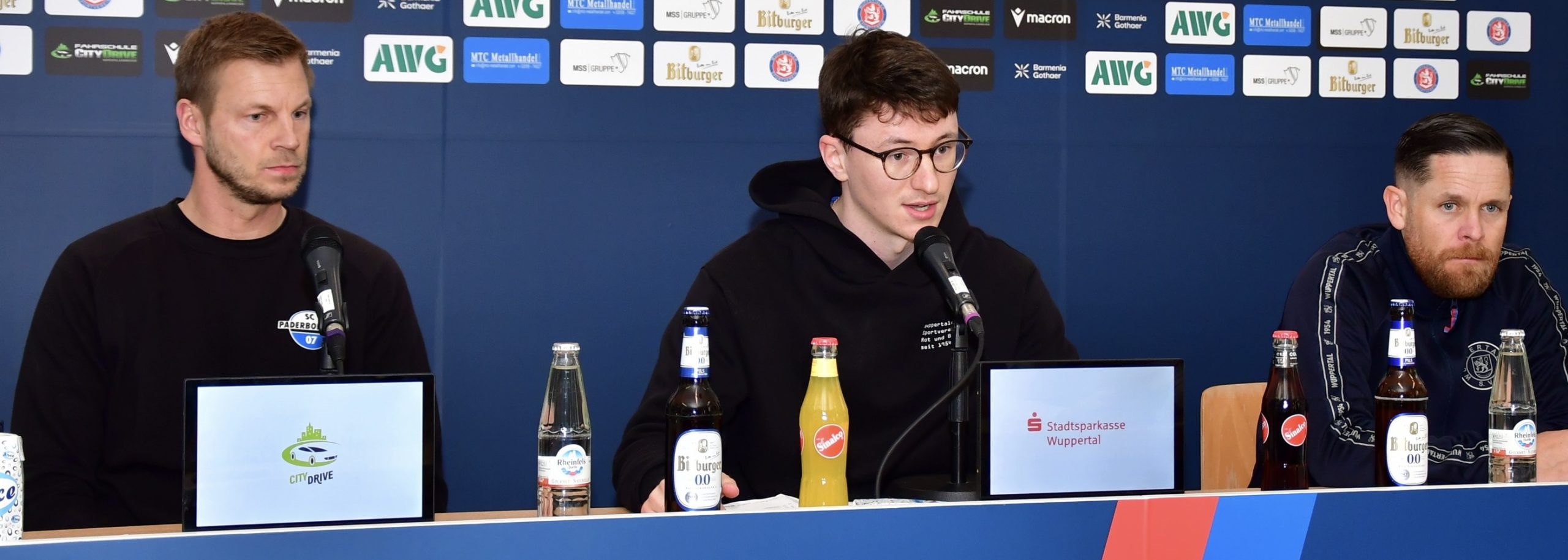 Zufrieden konnte bei der Pressekonferenz nach dem Spiel nur Paderborns Trainer Thomas Bertels (l.) sein. WSV-Pressesprecher Jonas Jütz (M.) und Cheftrainer Mike Wunderlich schauen sorgenvoll in die Zukunft – © Sportfotodienst Wuppertal / Jochen ClassenWuppertaler SV – SC Paderborn U23 1:3 (1:2)