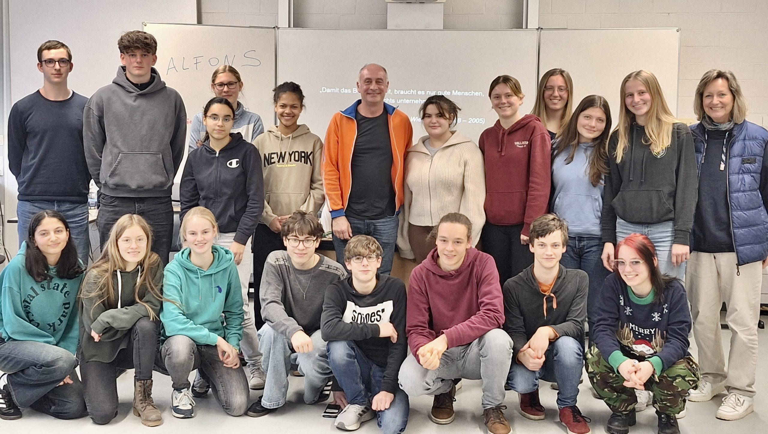Alfons: „Sehr, sehr oft, sogar schon, als ich noch ein Kind war. Ich habe meine Großmutter als großartige, beeindruckende Frau erlebt. Sie hat es geschafft, die Deutschen nicht zu hassen, was ich – ehrlich gesagt – als Kind nicht verstanden habe. Sie ging sehr oft in Schulen und hat mit Schülern über die NS-Zeit gesprochen, angetrieben von der Hoffnung, dass so etwas nie wieder passieren würde. Sie hielt Unmenschlichkeit für ein Gift, das sich schnell verbreiten kann, wenn man kein Gegengift findet. Und deshalb bin auch ich ständig auf der Suche nach einem Gegengift. Nicht allein, sondern mit meiner Stiftung und oft auch gemeinsam mit Jugendlichen, die ich auffordere: ‚Lasst uns gemeinsam dieses Gegengift suchen‘. Das Gegengift heißt Menschlichkeit. Und diese Menschlichkeit, die eigentlich in jedem von uns steckt, darf man nicht einschlafen lassen. Davon bin ich fest überzeugt.“