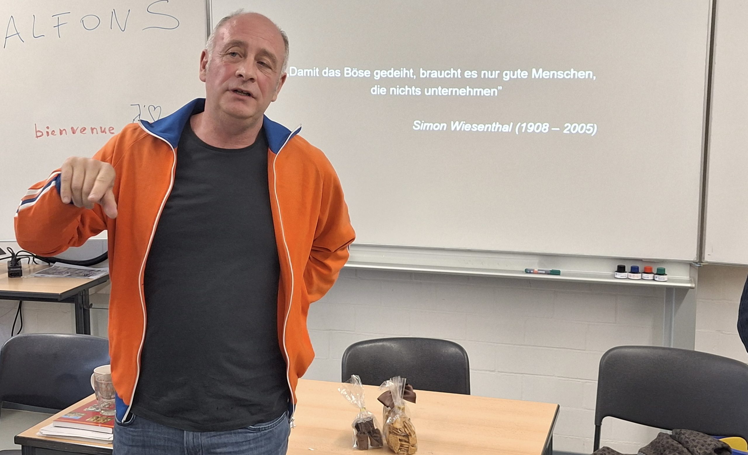Alfons als Demokratie-Lehrer bei einem Auftritt in einer Bonner Schule für sein Projekt „Alfons spielt für Schulen“ – © privatDS: Stimmt es wirklich, dass die berühmte orangefarbene „Kutte“, mit der Sie sich bei Ihren Auftritten schmücken, immer noch das Original ist. Waschen Sie diese gar nicht oder nur im Schongang?
