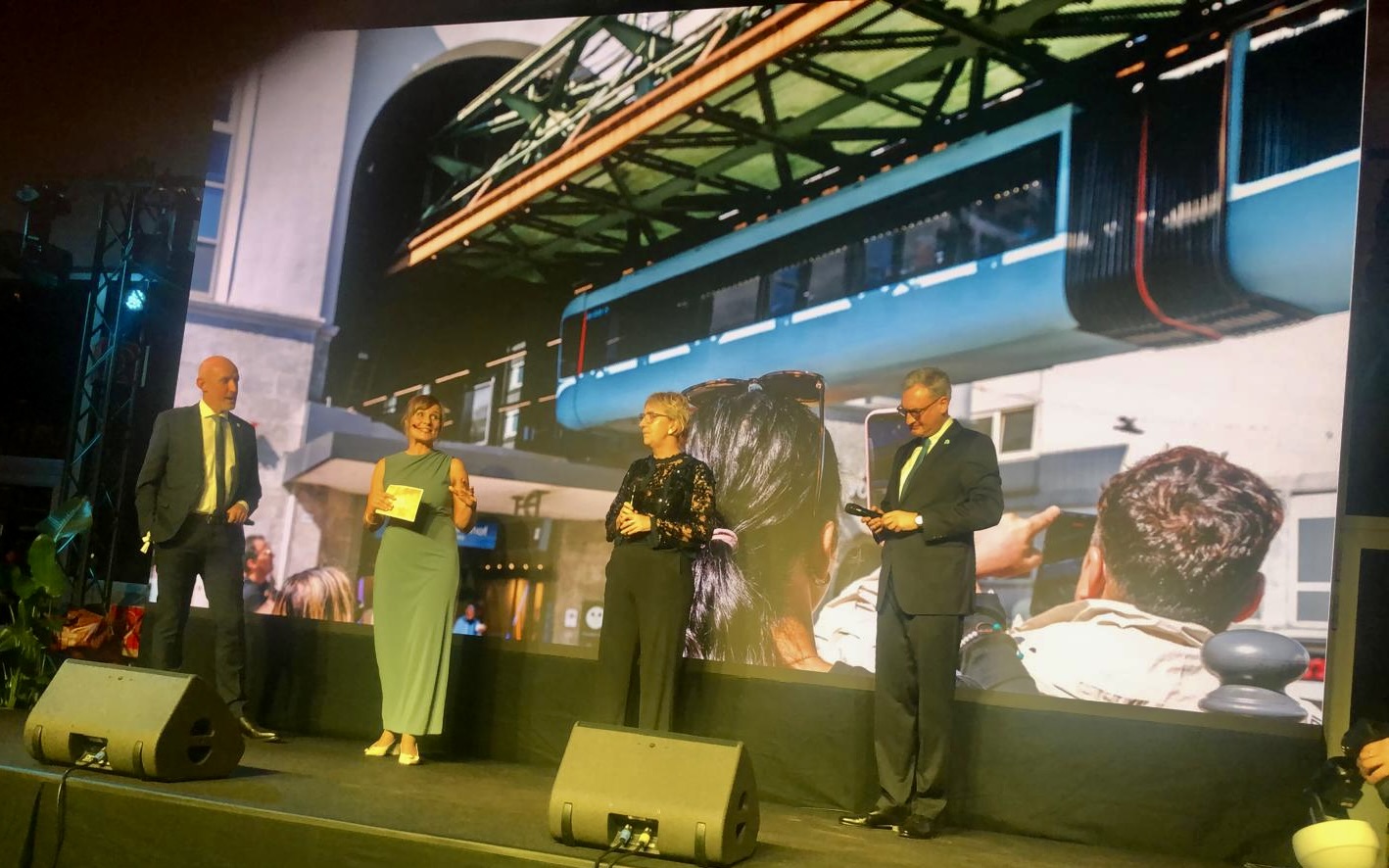 Lore Duwe eingerahmt von NRW-Verkehrsminister Oliver Krische und Oberbürgermeisterin Miriam Scherff- © privatMal unter uns! „Ich bin Schwebebahn“, zu diesem Motto kamen Wuppertaler aus Politik, Wirtschaft, Wissenschaft und Kultur in der Wagenhalle Vohwinkel zusammen, getreu diesem Motto. Die Wagenhalle, in der normalerweise hochprofessionelle Techniker der Stadtwerke die Wagen der Schwebebahn-Flotte warten und instand halten, erstrahlte im Glanz von 1.000 Kerzen. Ein festliches Menü und erlesene Getränke liessen die geladenen Gäste bis nach Mitternacht ausharren. Denn um 0.00 Uhr wurde auf dem Freigelände angestoßen und Geburtstag gefeiert – nämlich der 125. der Schwebebahn.