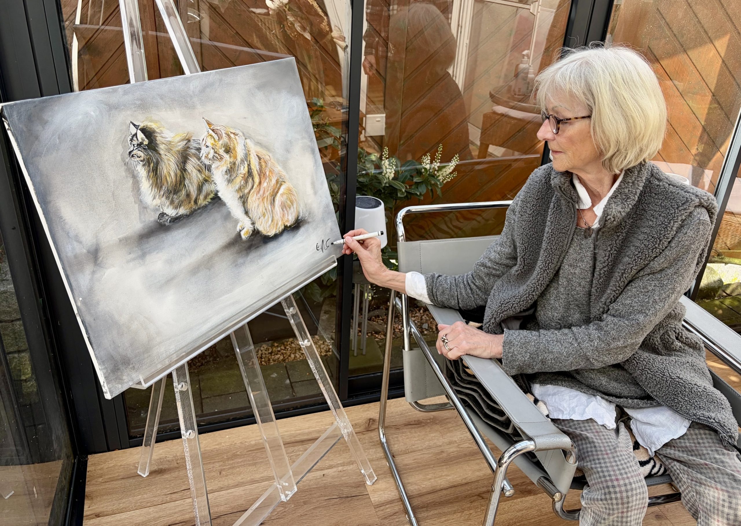 Malerin Ellen Neugebauer signiert das sehr gelungene Katzenbild in ihrem gemütlichen Wintergarten – © Paul CoonWeiter mit: