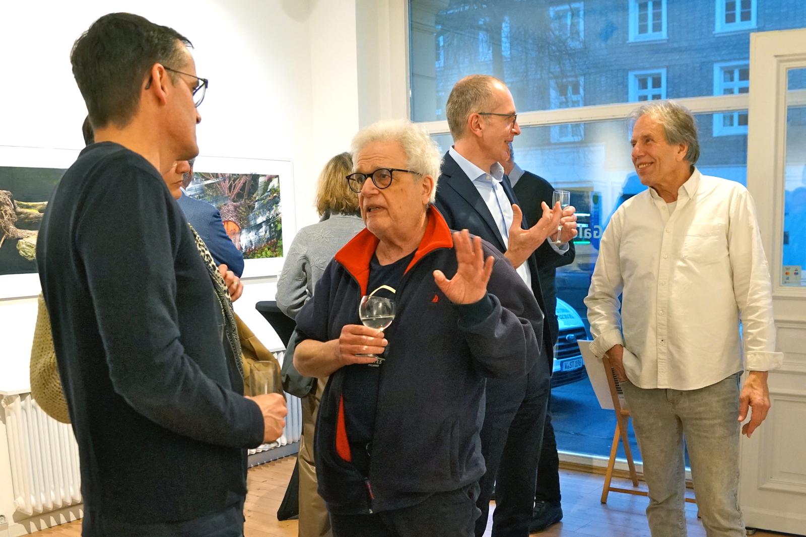 Der Foto-Künstler Michael Utz (M.) bei der Vernissage einer Gemeinschafts-Ausstellung mit Christian von Grumbkow (r.) – © privatDer erfolgreiche Fotograf formuliert seinen künstlerischen Ansatz so: „Architektur ist eines meiner fotografischen Themen. Der moderne Anbau des Jüdischen Museums von Daniel Libeskind in Berlin zeigt im Untergeschoss eindringliche und erschütternde Exponate zum Thema Holocaust. Flucht, Verfolgung, Vertreibung und massenhaftes gewaltsames Sterben sind immer noch ein aktuelles Thema. Meine zum Teil montierten Fotografien verstehe ich als Mahnung und Aufforderung zum Handeln, um dem weltweiten Elend, das Flucht, Krieg und Gewaltherrschaft mit sich bringen, Einhalt zu gebieten. Die Würde des Menschen ist unantastbar, aber sie ist gefährdet.“